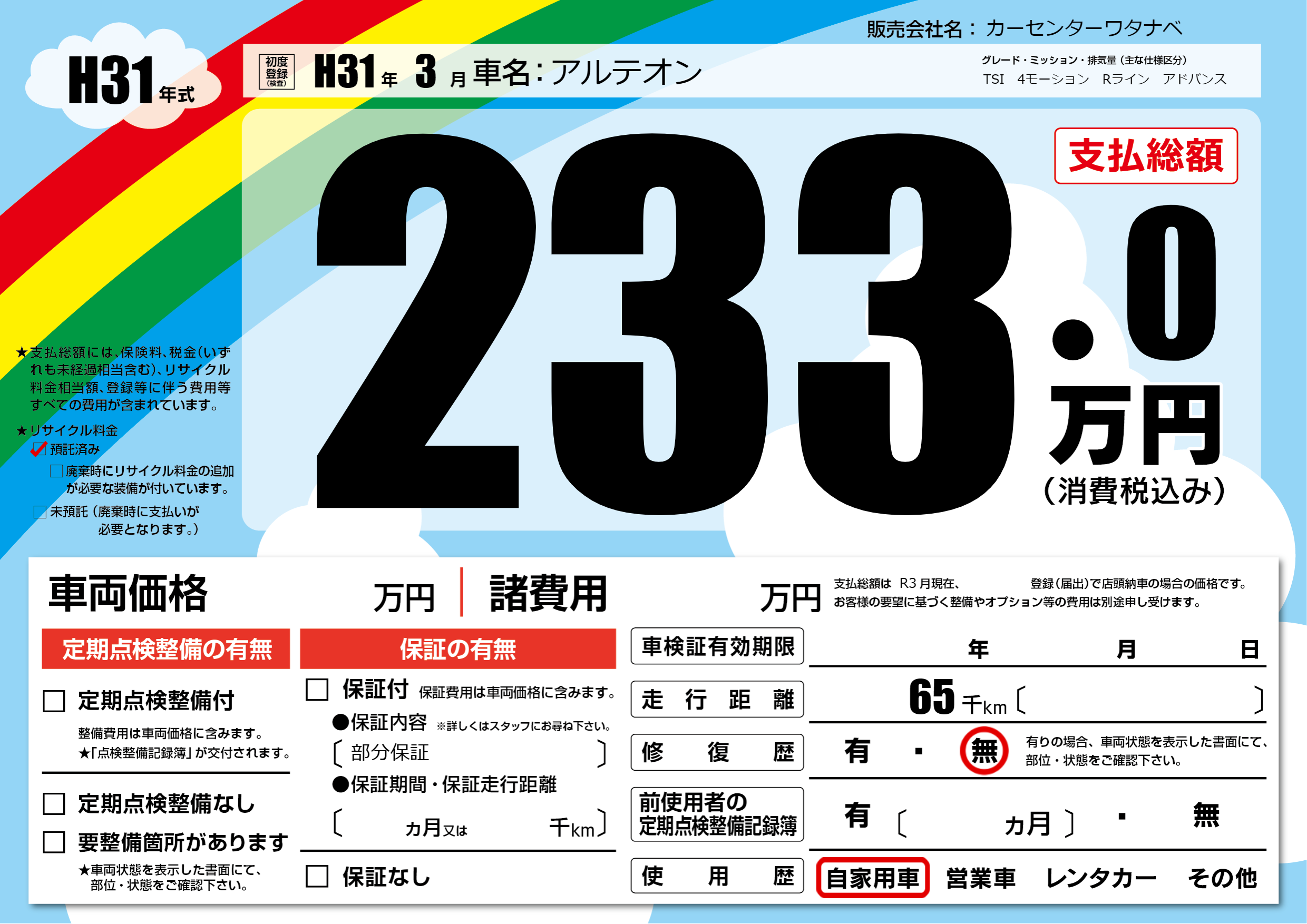 | 車名 | アルテオン | グレード ミッション 排気量 |