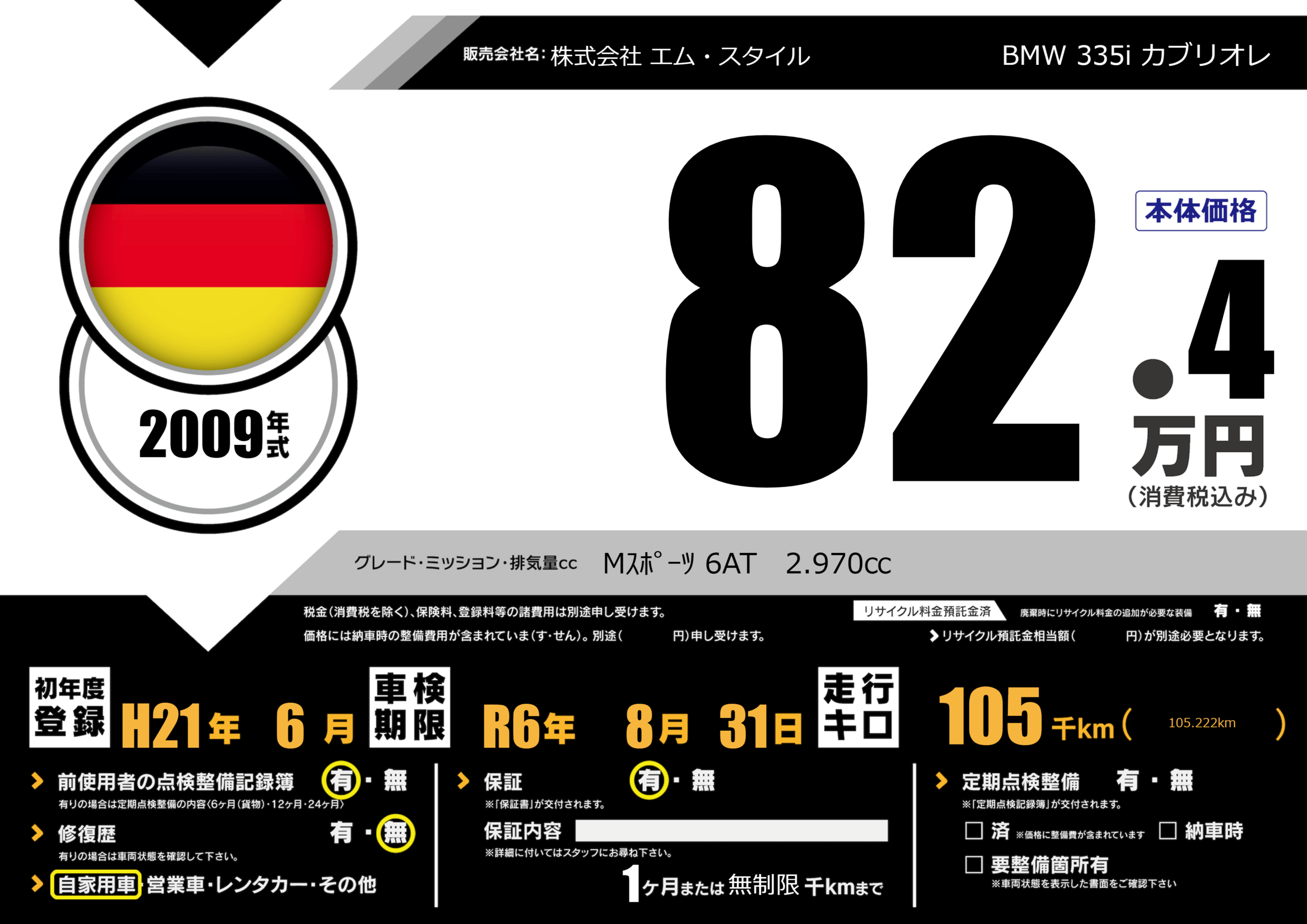 | 車名 | BMW 335i カブリオレ | グレード ミッション 排気量 |