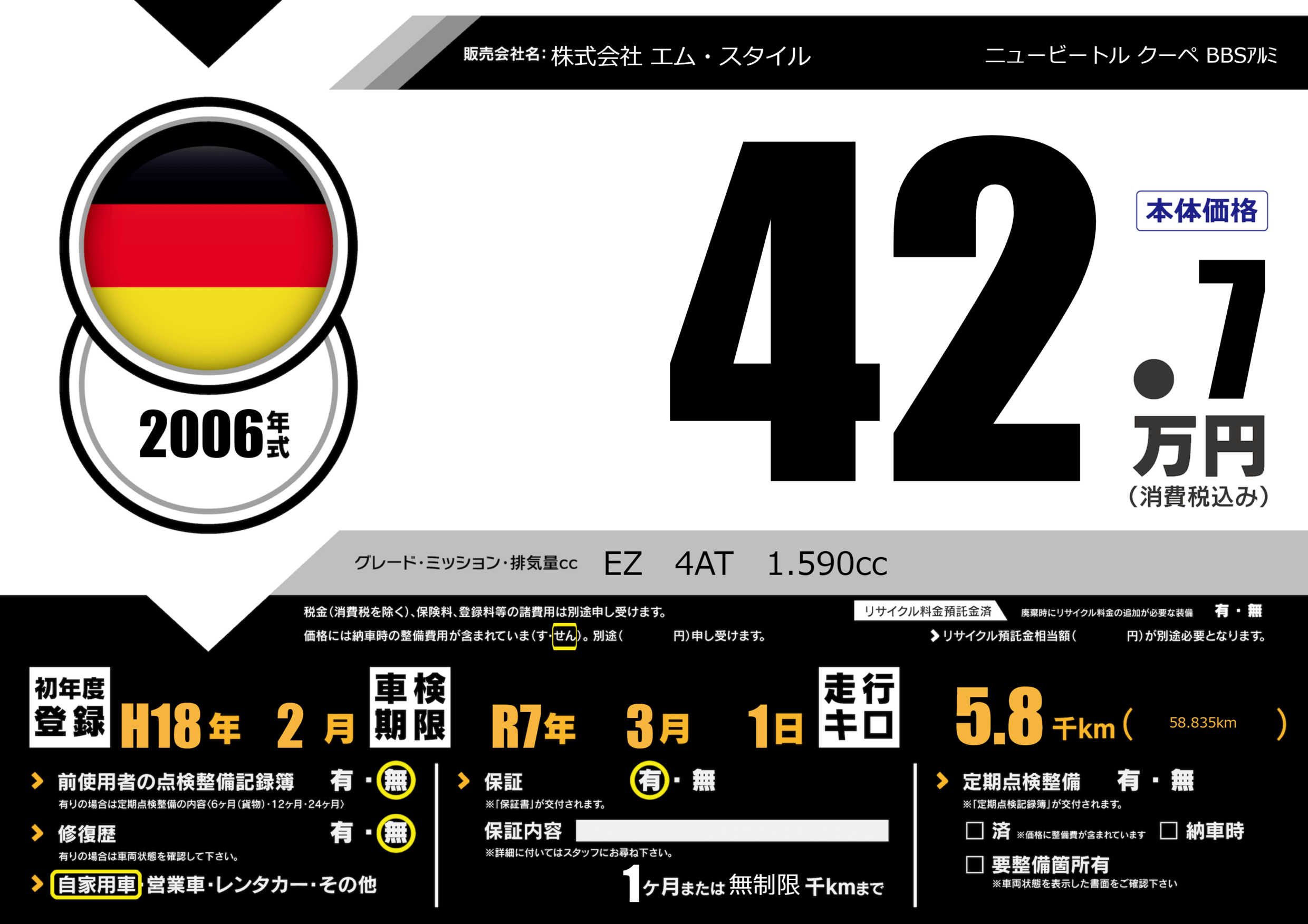 | 車名 | ニュービートル クーペ BBSアルミ | グレード ミッション 排気量 |
