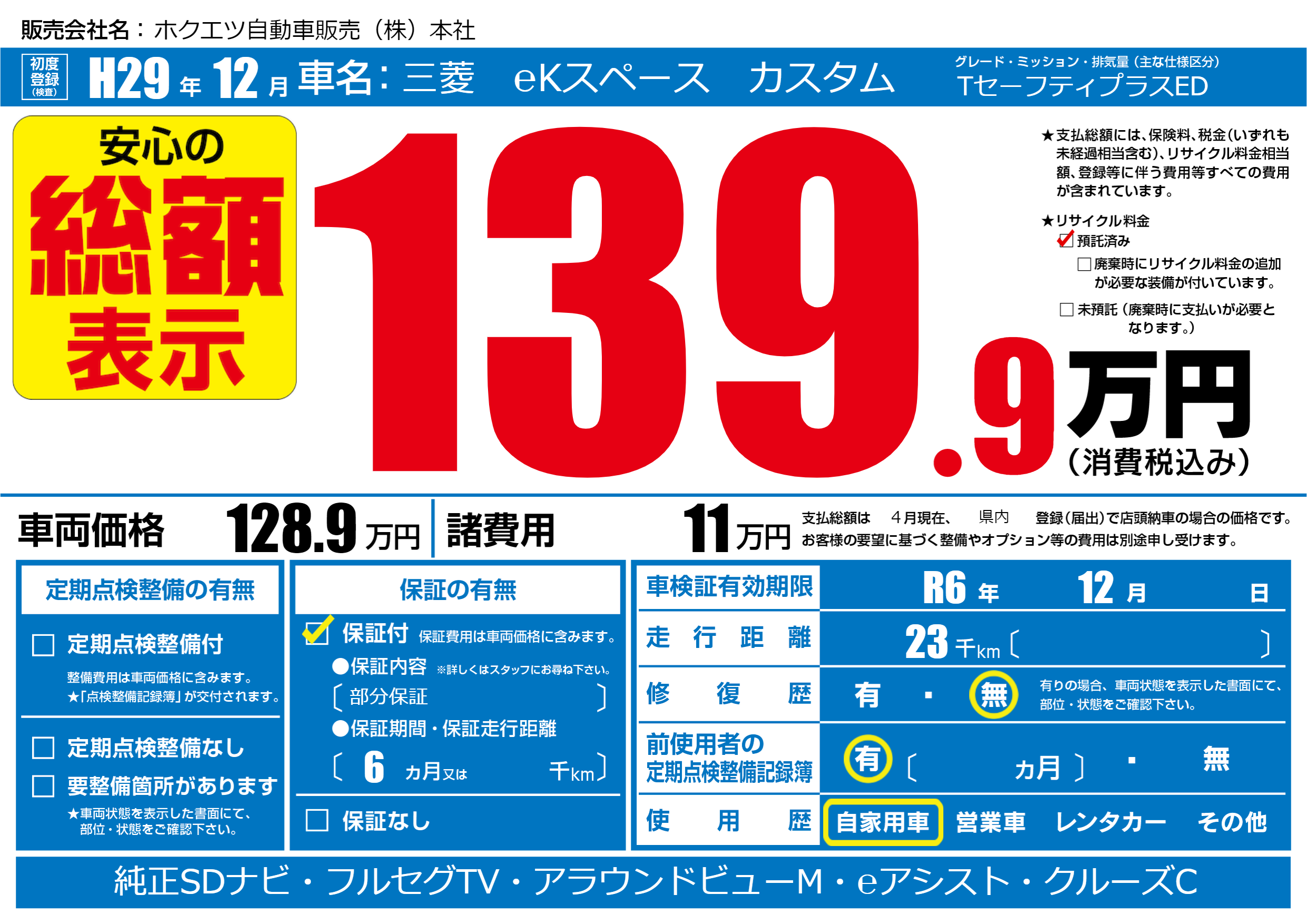 | 走行キロ | 2.3万km | 初年度登録 | H29年12月 |