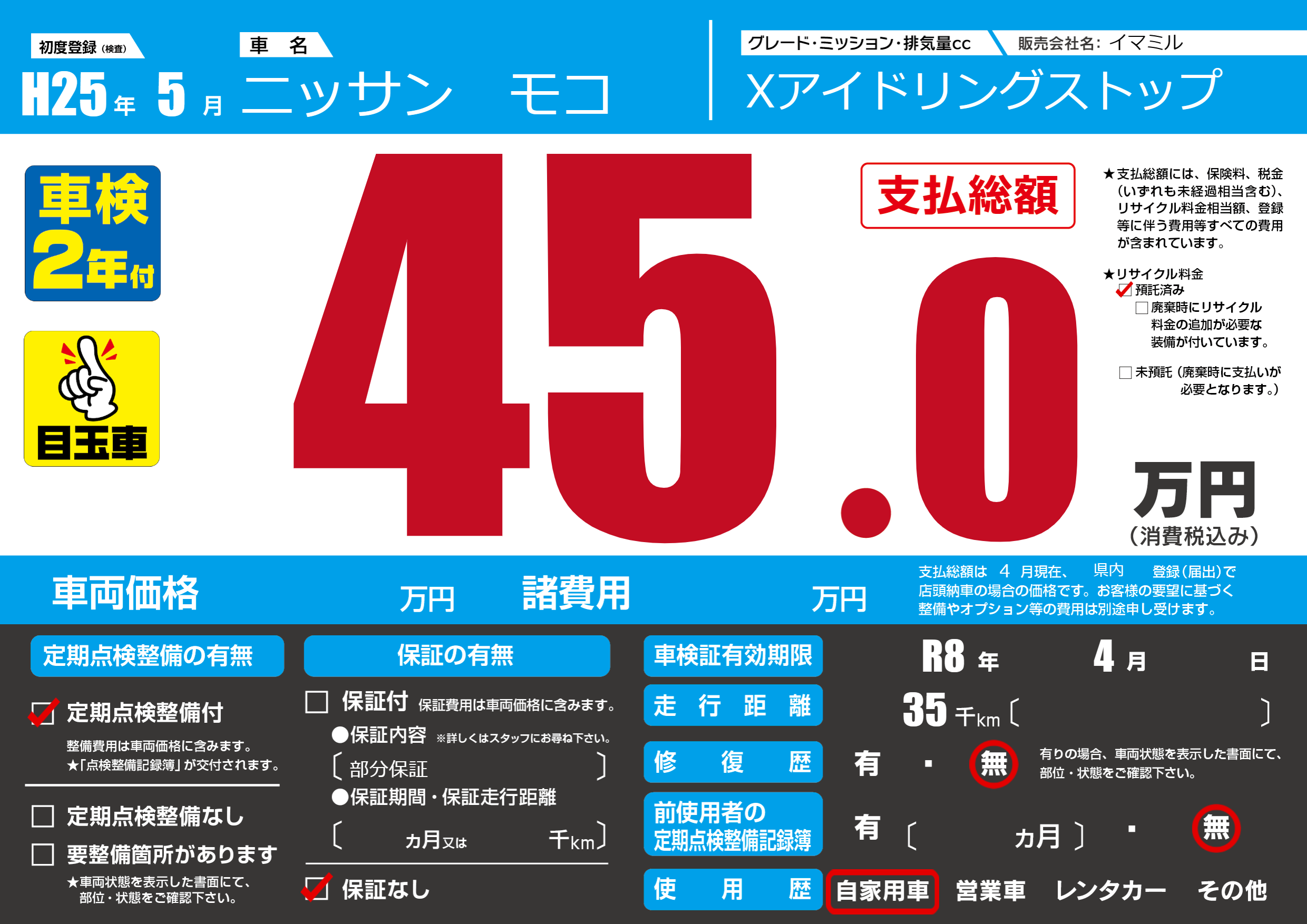 | 走行キロ | 3.5万km | 初年度登録 | H25年5月 |