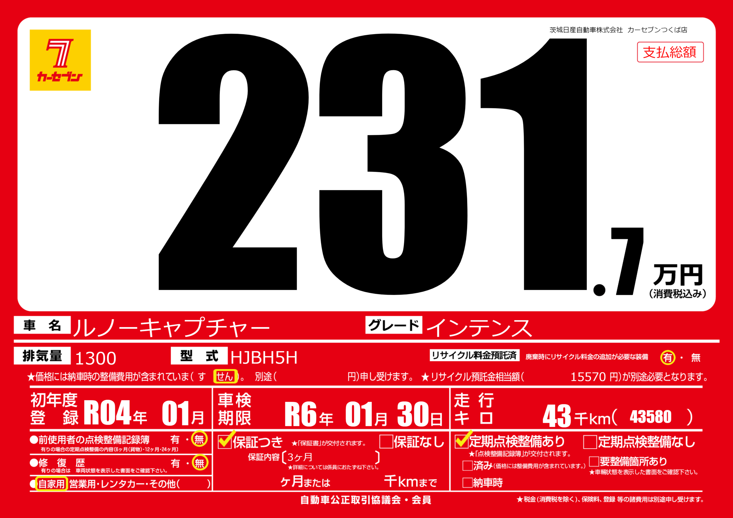 なし | 車検制限 | R6年01月30月 |