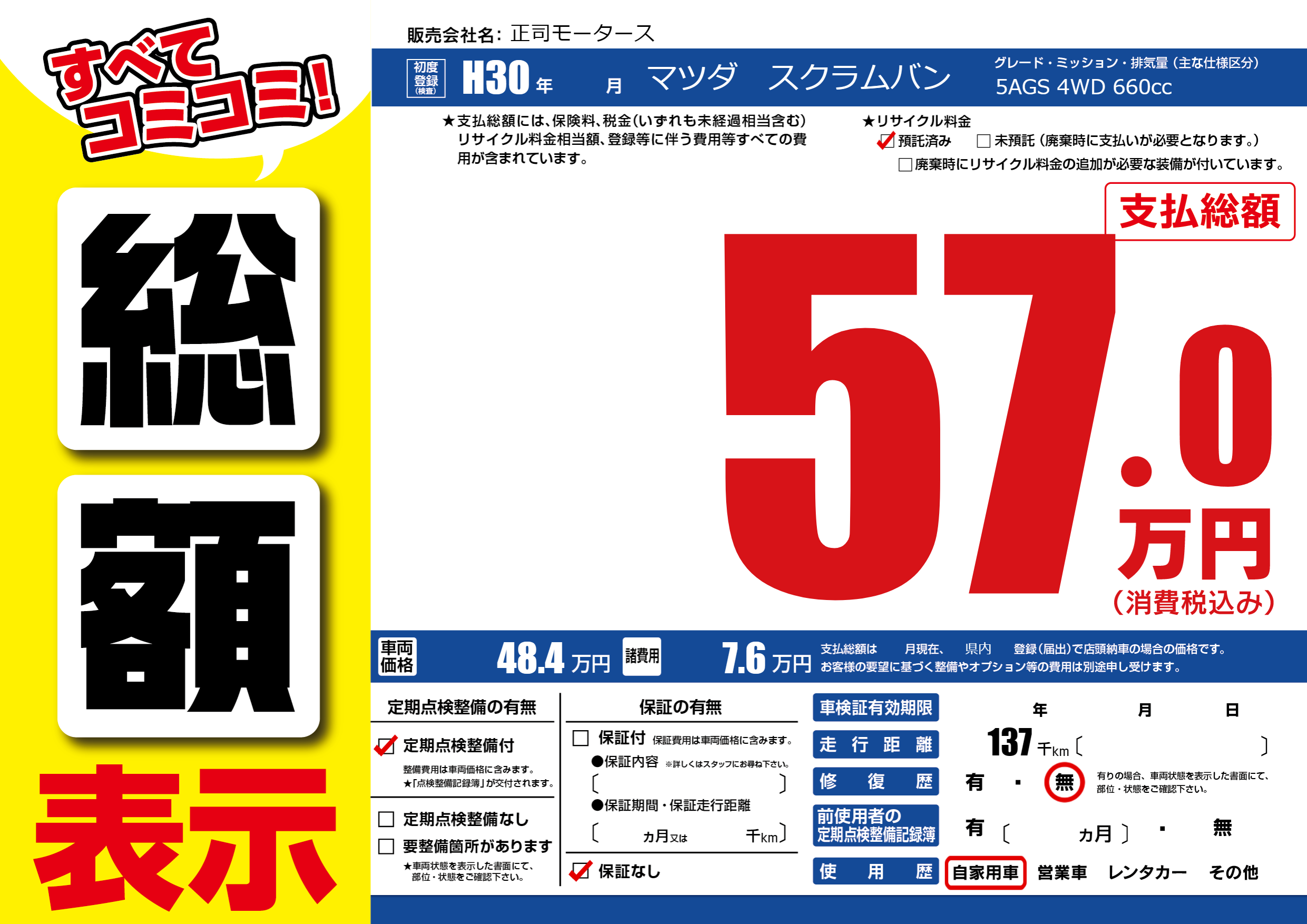 | 車名 | マツダ スクラムバン | グレード ミッション 排気量 |
