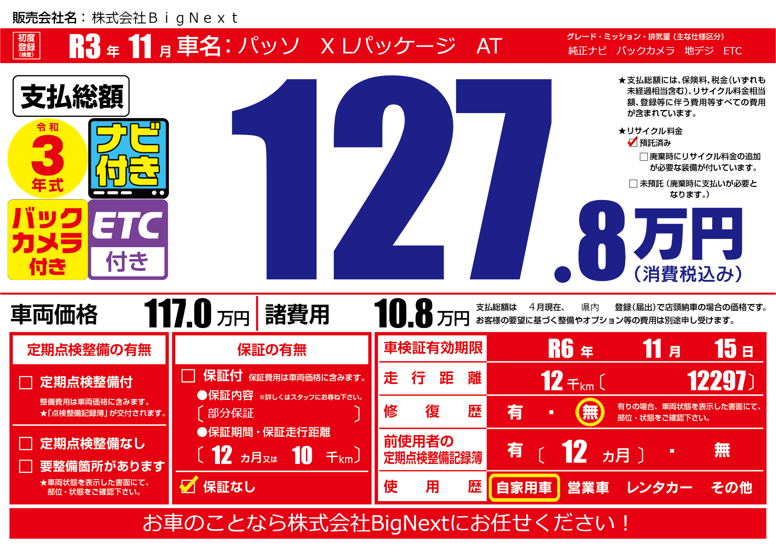 | 車名 | パッソ X Lパッケージ AT | グレード ミッション 排気量 |