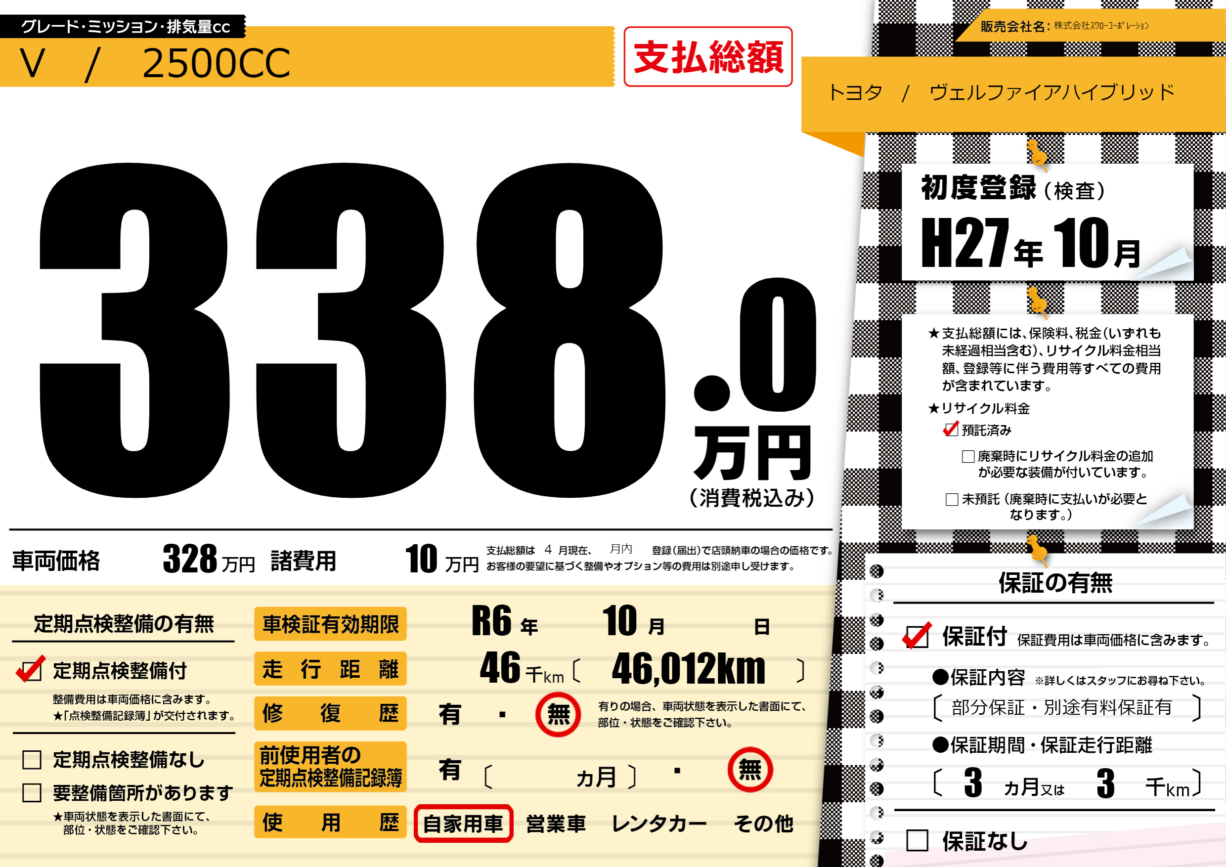 | 車名 | トヨタ / ヴェルファイアハイブリッド | グレード ミッション 排気量 |
