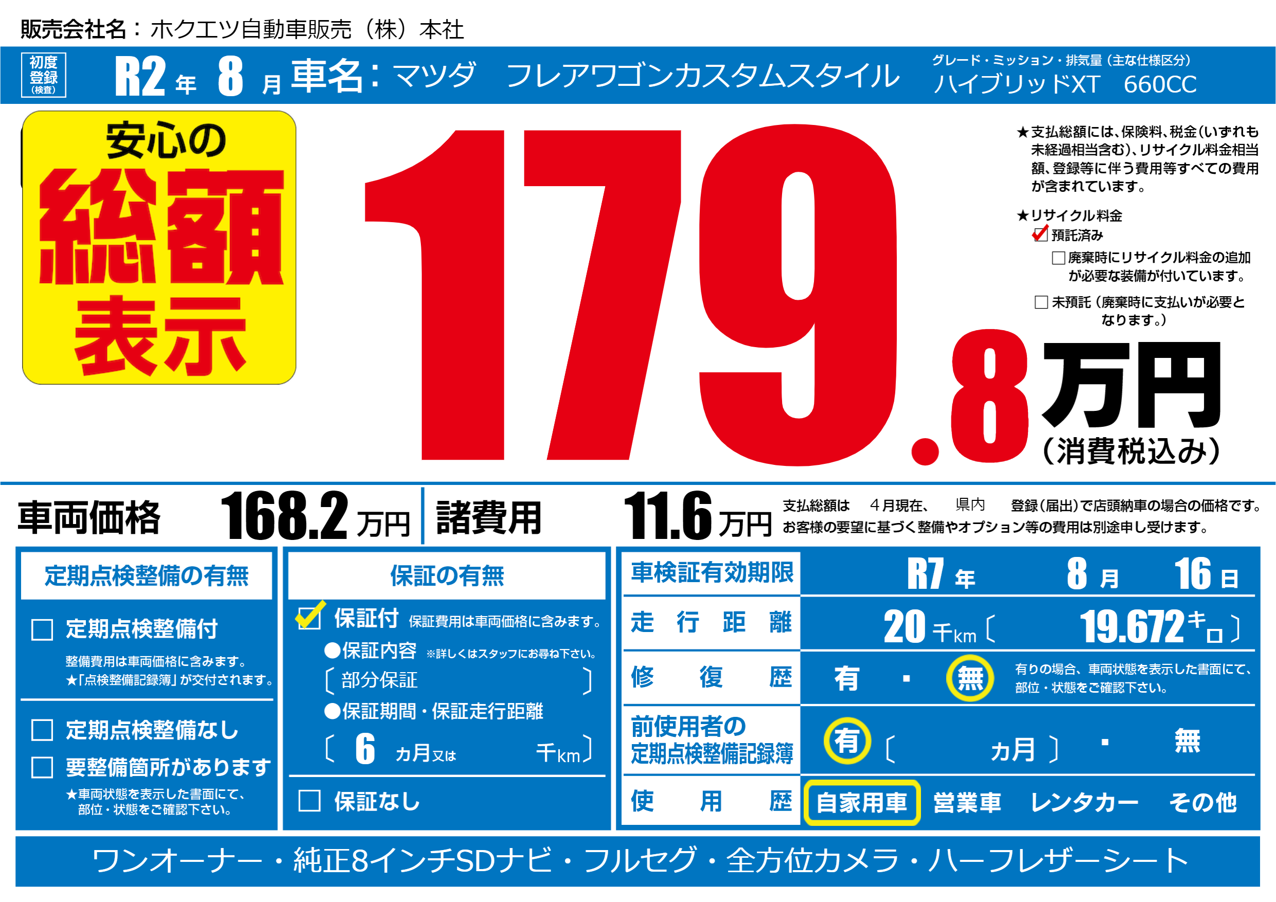 | 走行キロ | 2万km | 初年度登録 | R2年8月 |