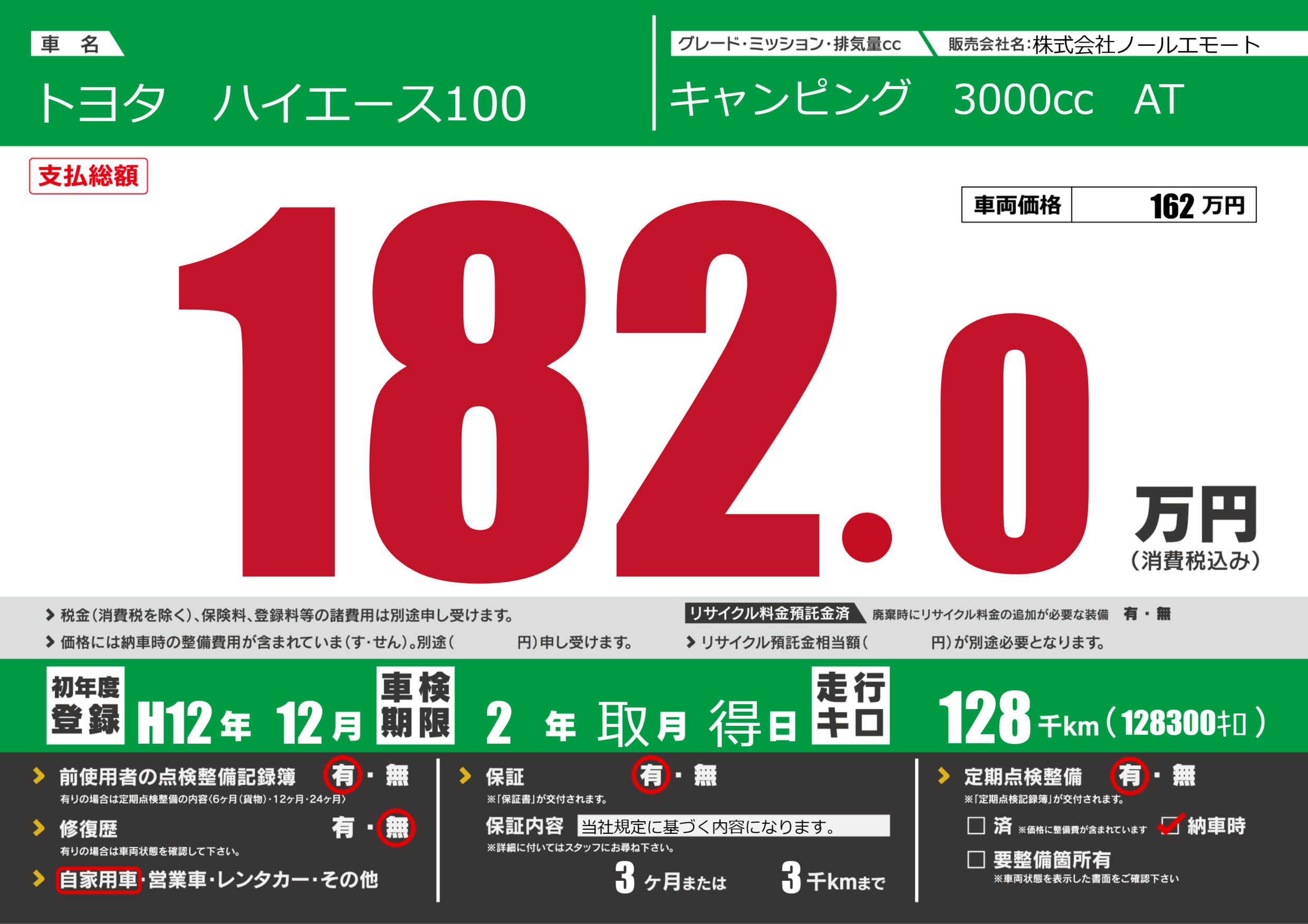 | 車名 | トヨタ ハイエース100 | グレード ミッション 排気量 |