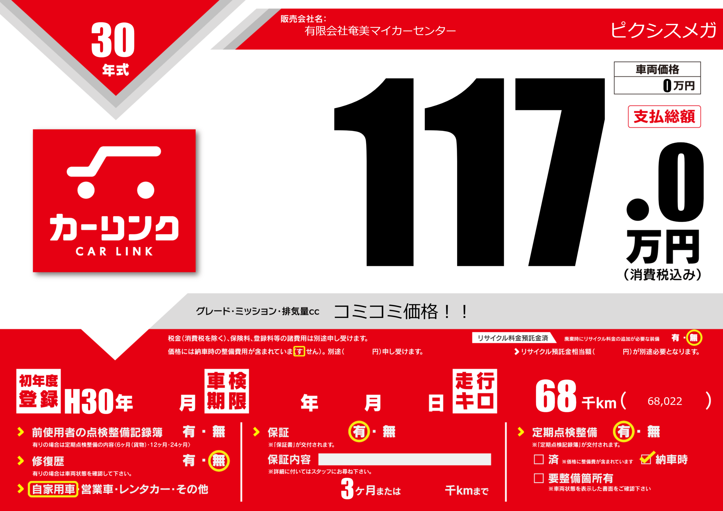 | 定期点検整備 | 定期点検整備あり 納車時あり | ||