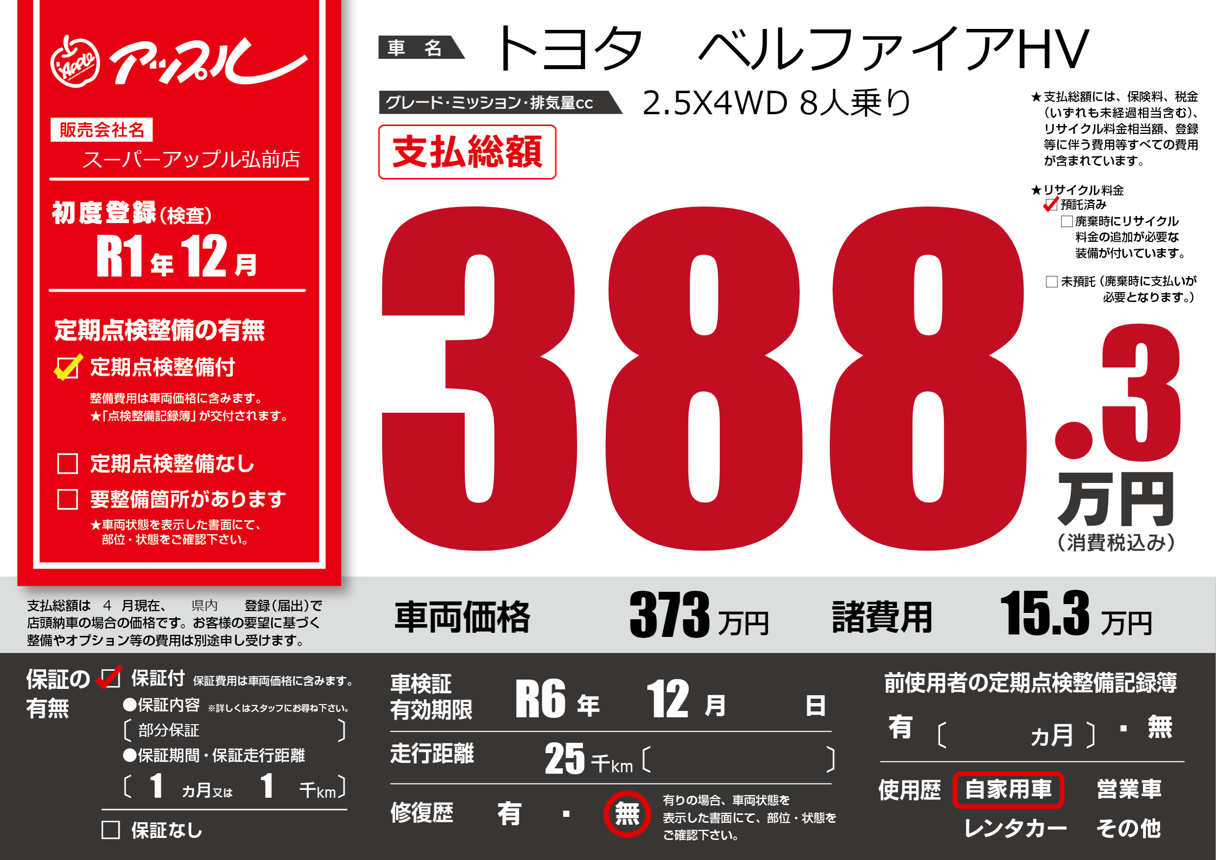 | 車名 | トヨタ ベルファイアHV | グレード ミッション 排気量 |