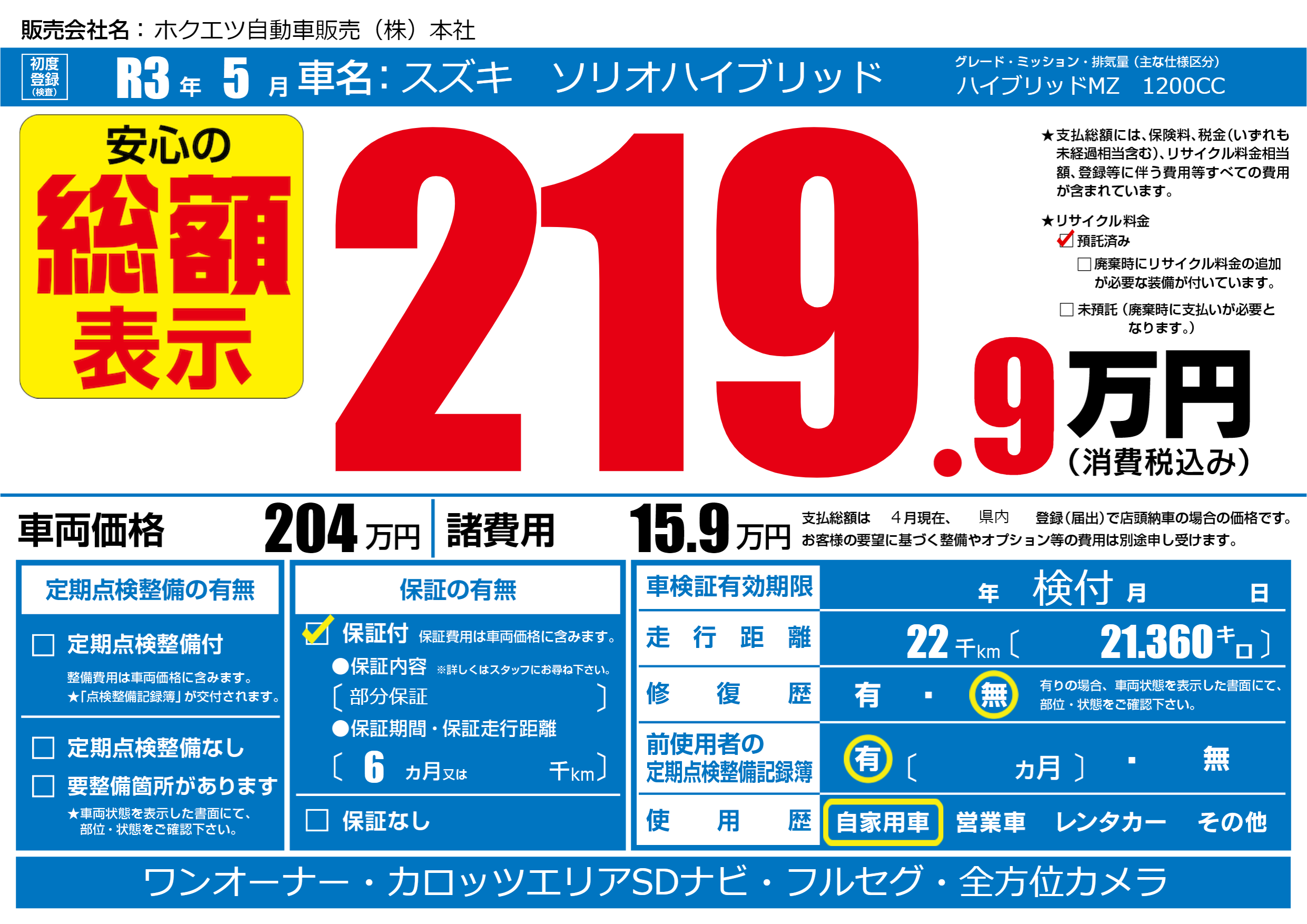 | 走行キロ | 2.2万km | 初年度登録 | R3年5月 |