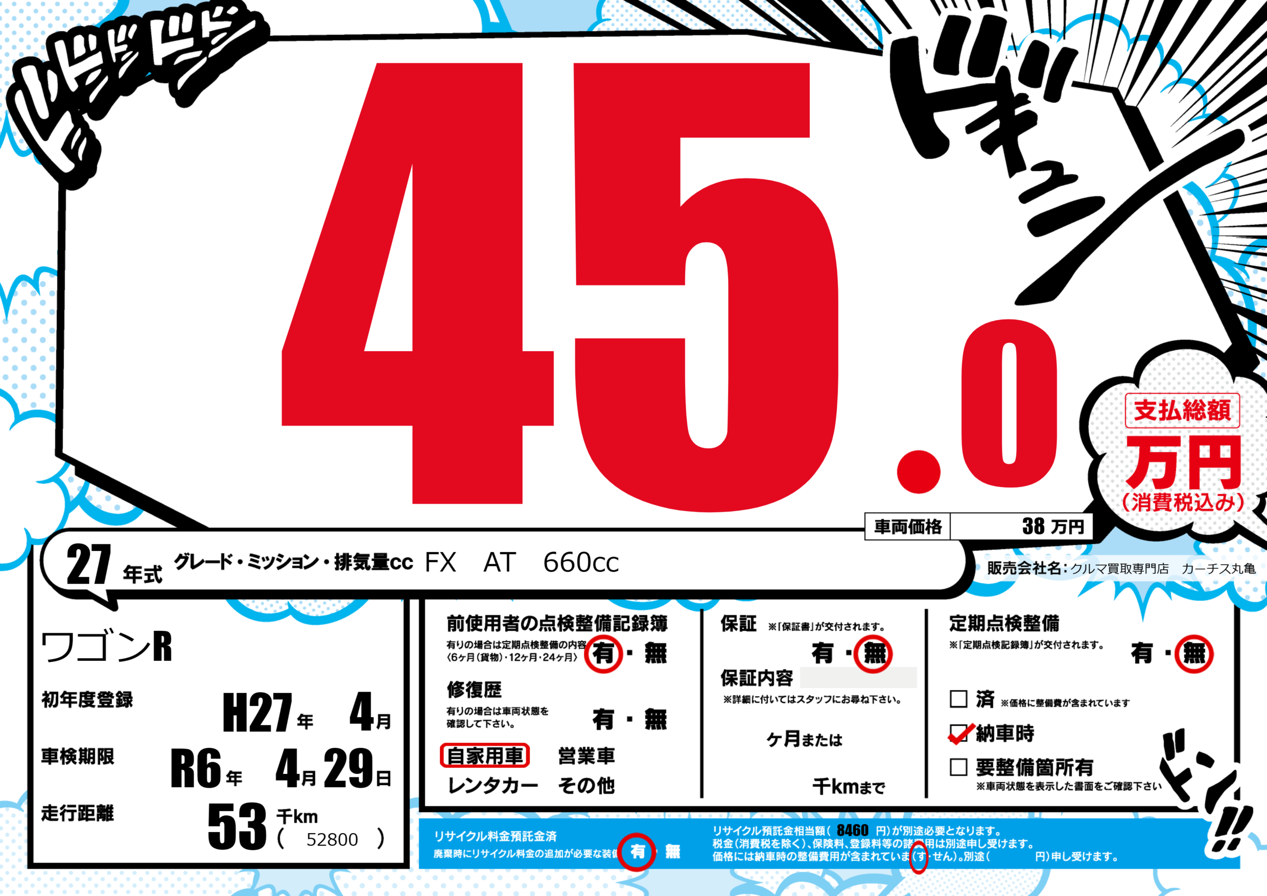 | 車名 | ワゴンR | グレード ミッション 排気量 |