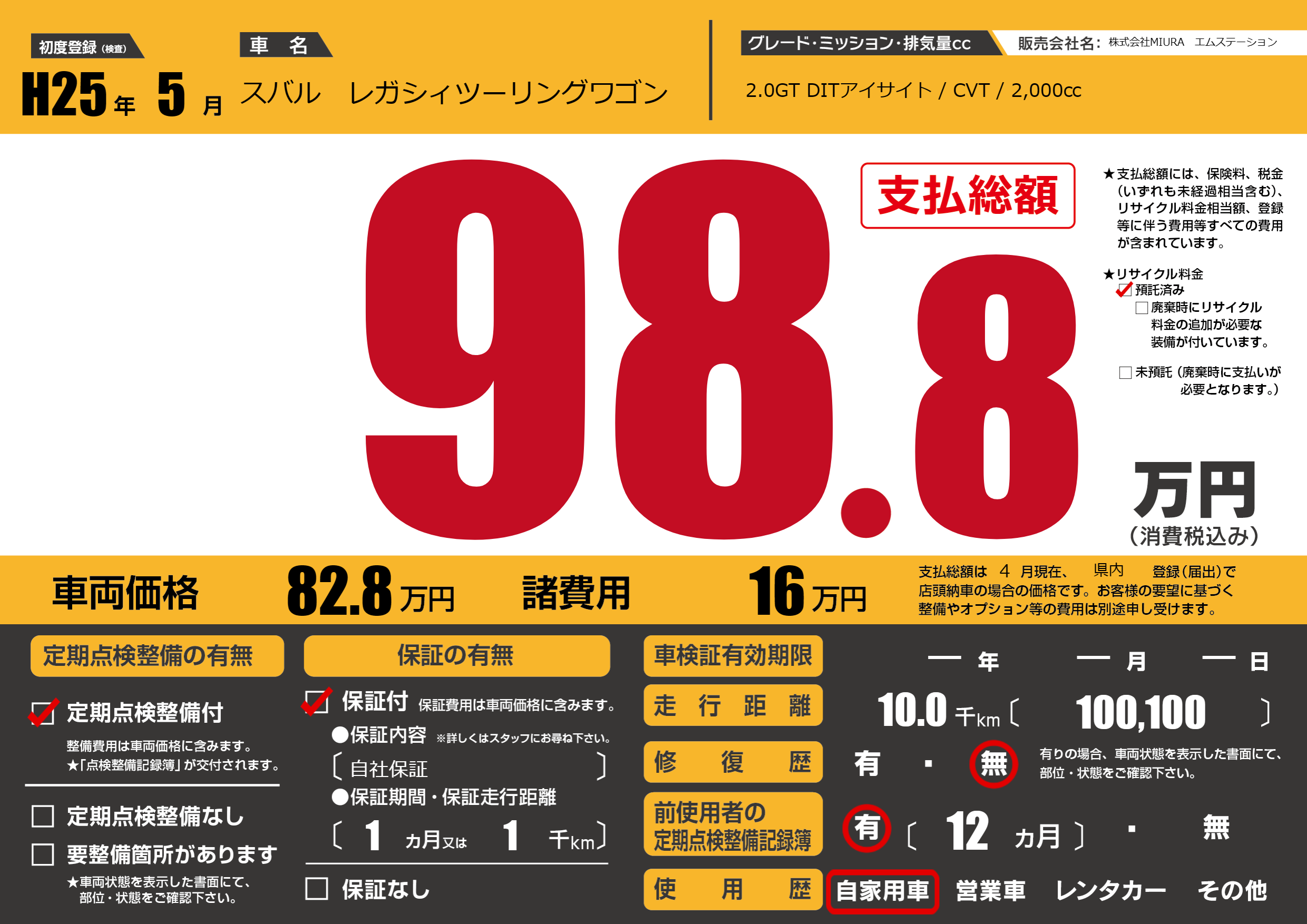 | 車名 | スバル レガシィツーリングワゴン | グレード ミッション 排気量 |