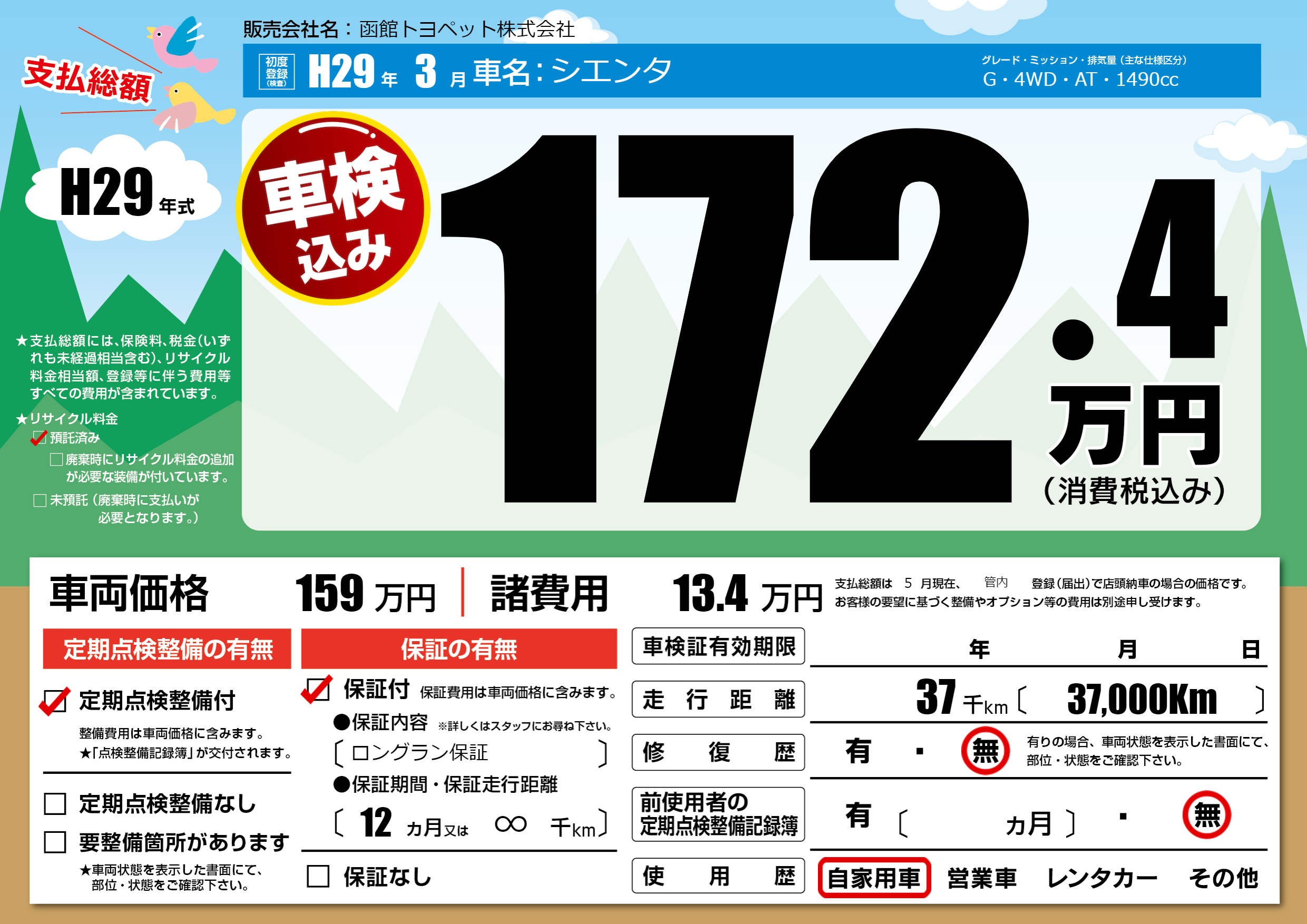 | 車名 | シエンタ | グレード ミッション 排気量 |