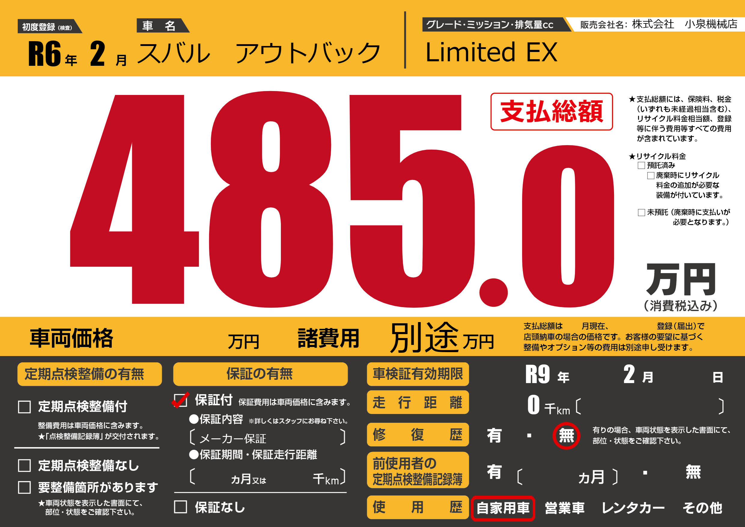 | 車名 | スバル アウトバック | グレード ミッション 排気量 |