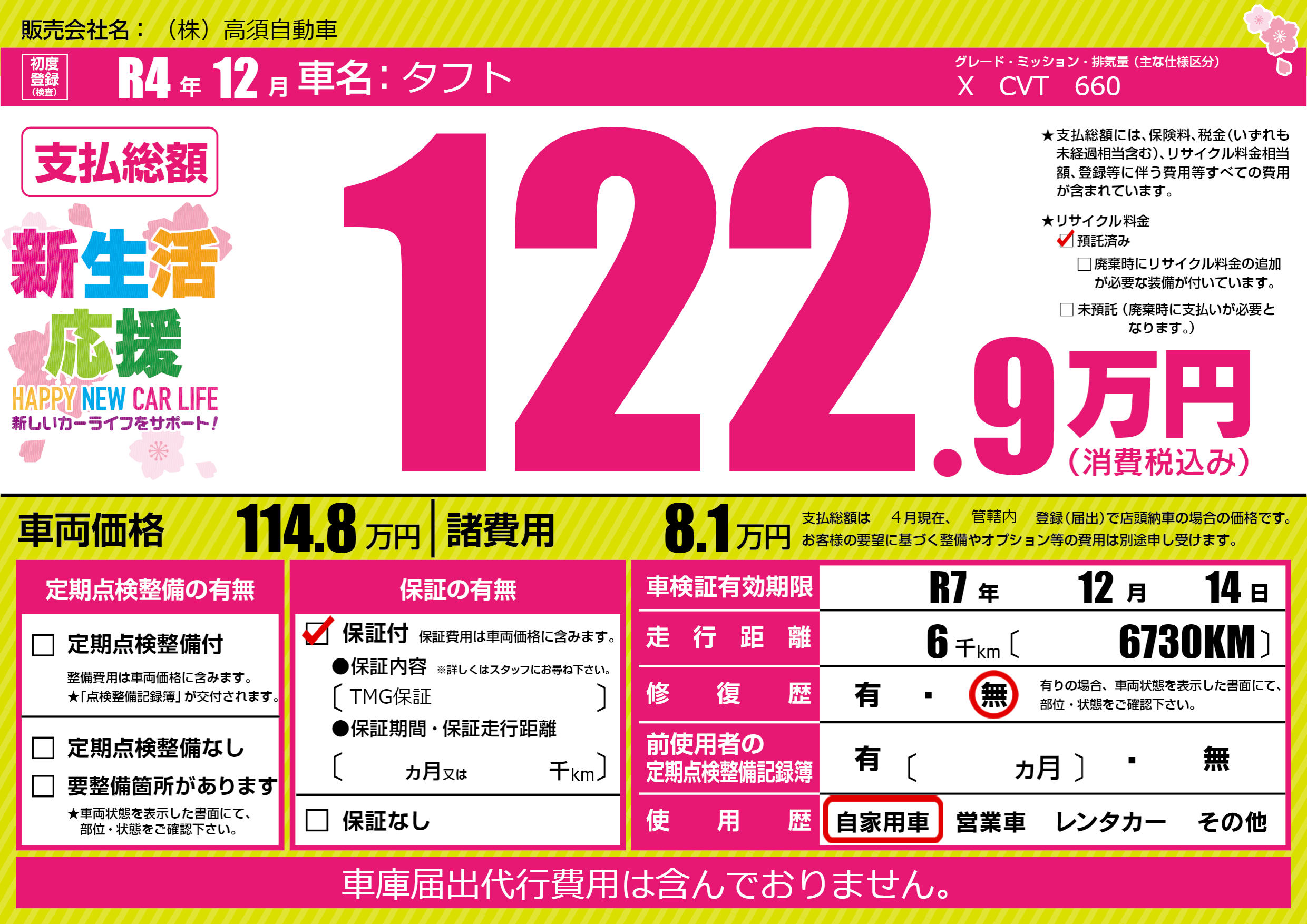 保証付き 保証内容(TMG保証) ---ヶ月または()千kmまで |