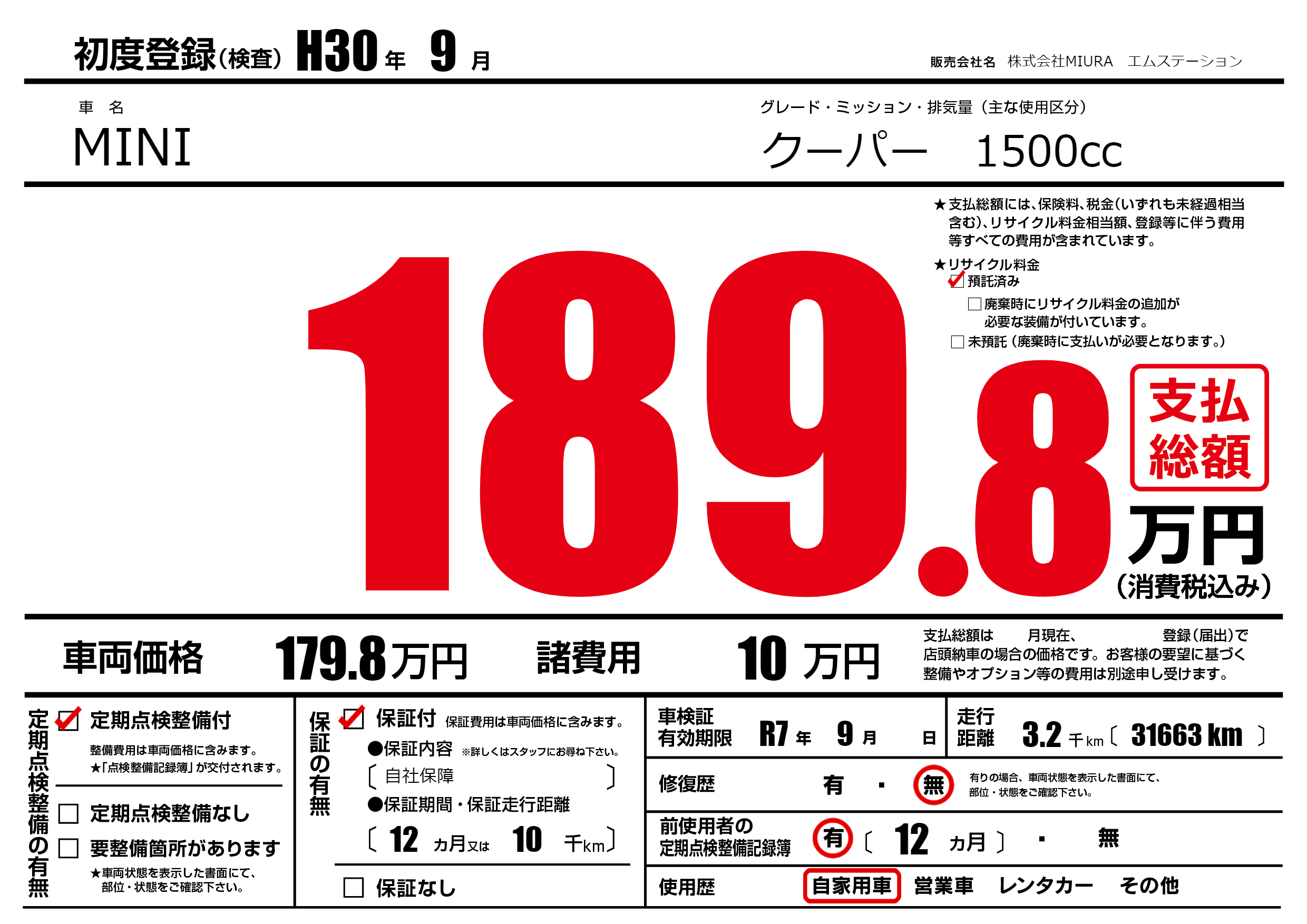 | 車検制限 | R7年 9月 - 日 | ||
