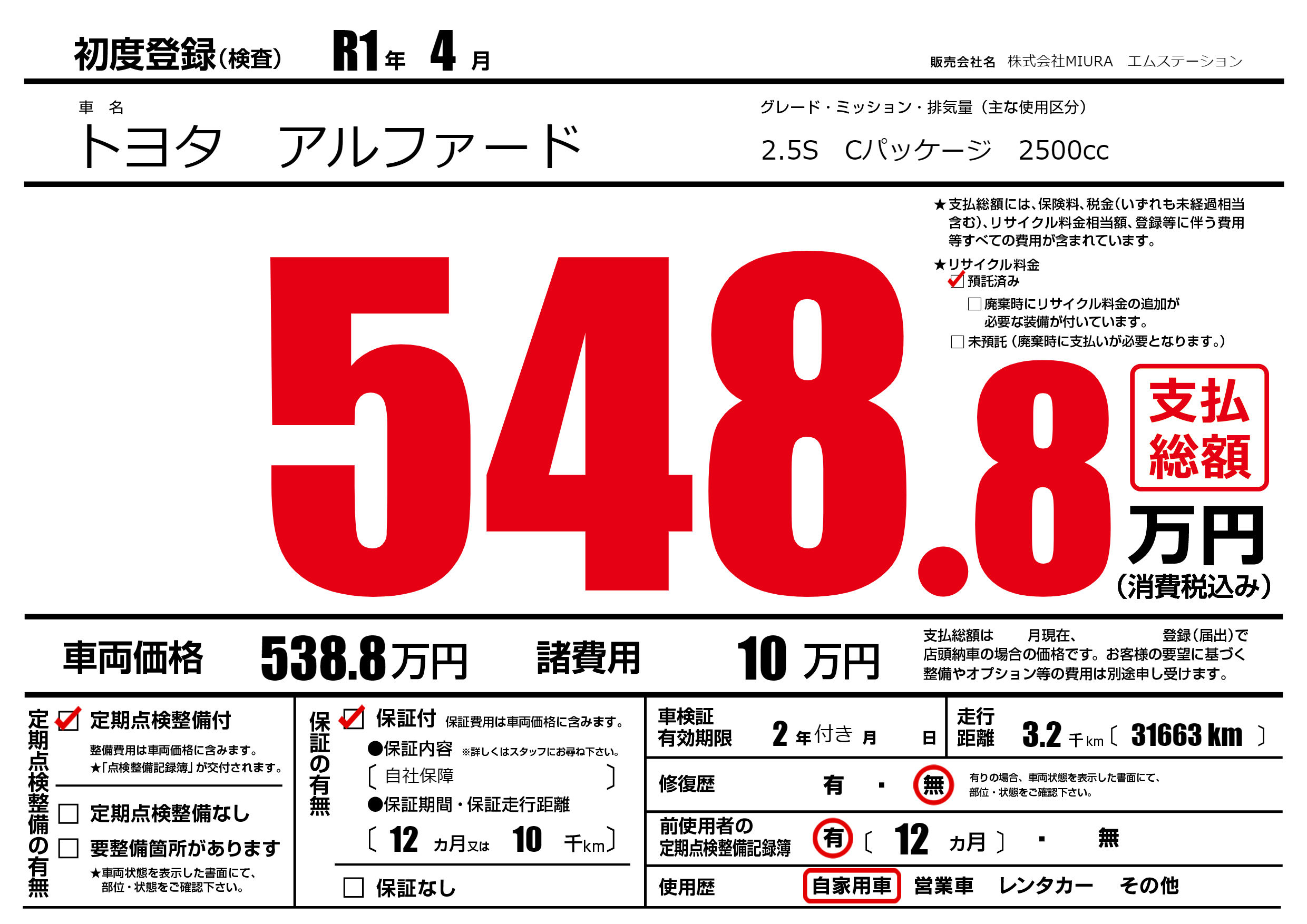 | 走行キロ | 0.3万km | 初年度登録 | R1年4月 |