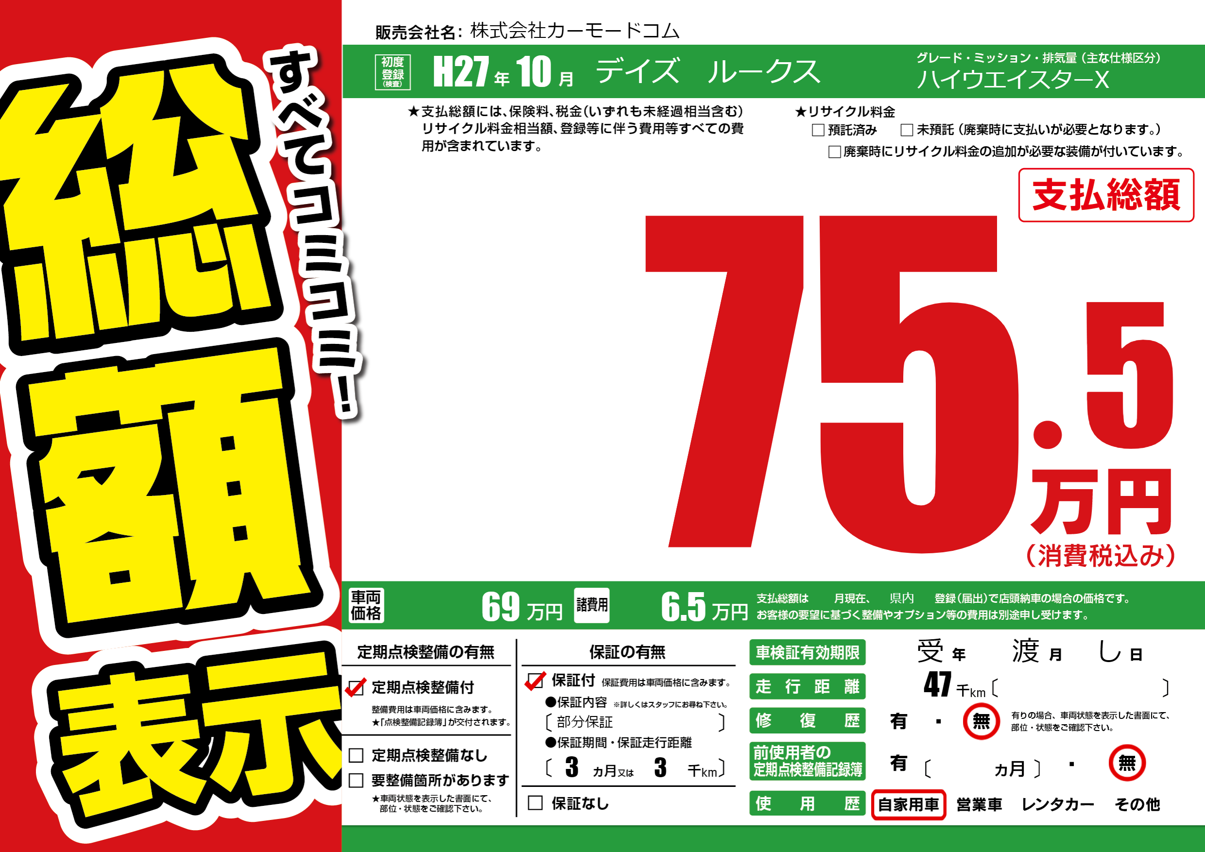 | 走行キロ | 4.7万km | 初年度登録 | H27年10月 |