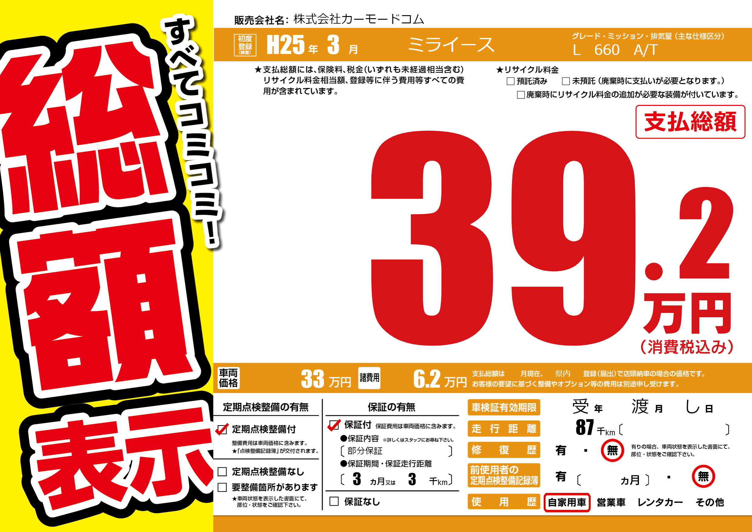 | 走行キロ | 8.7万km | 初年度登録 | H25年3月 |