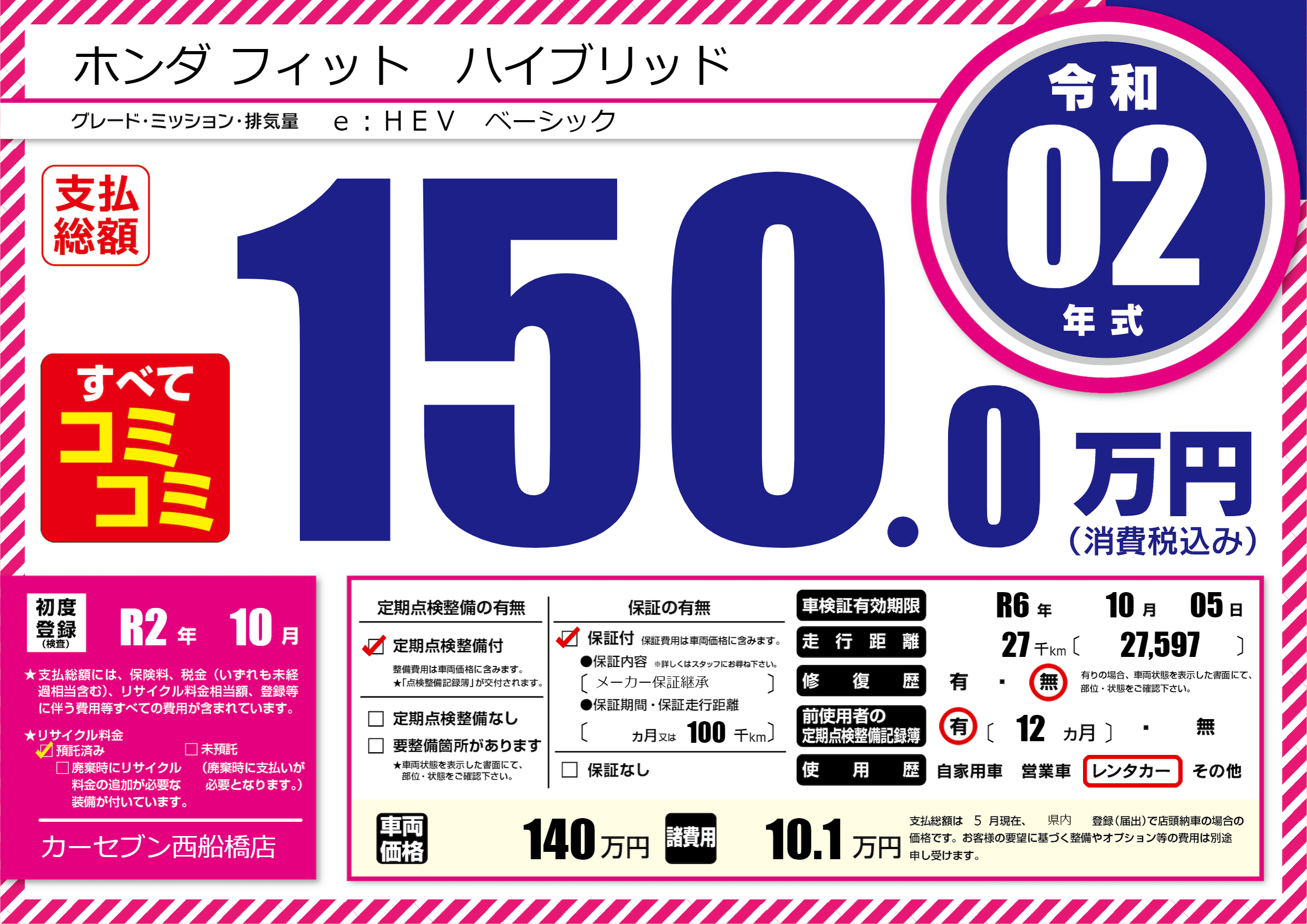 | 車名 | ホンダ フィット ハイブリッド | グレード ミッション 排気量 |