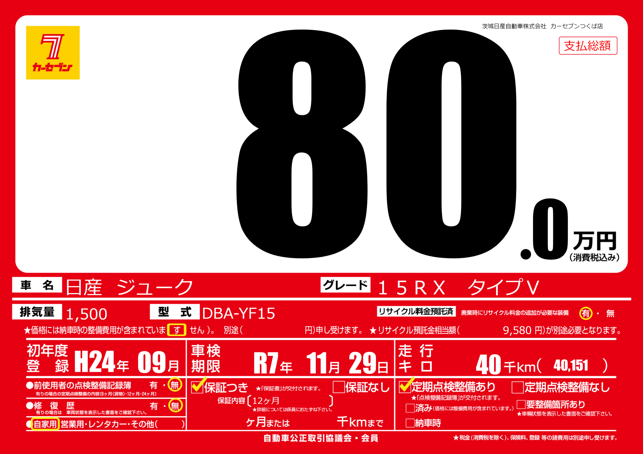 | 車名 | 日産 ジューク | グレード ミッション 排気量 |