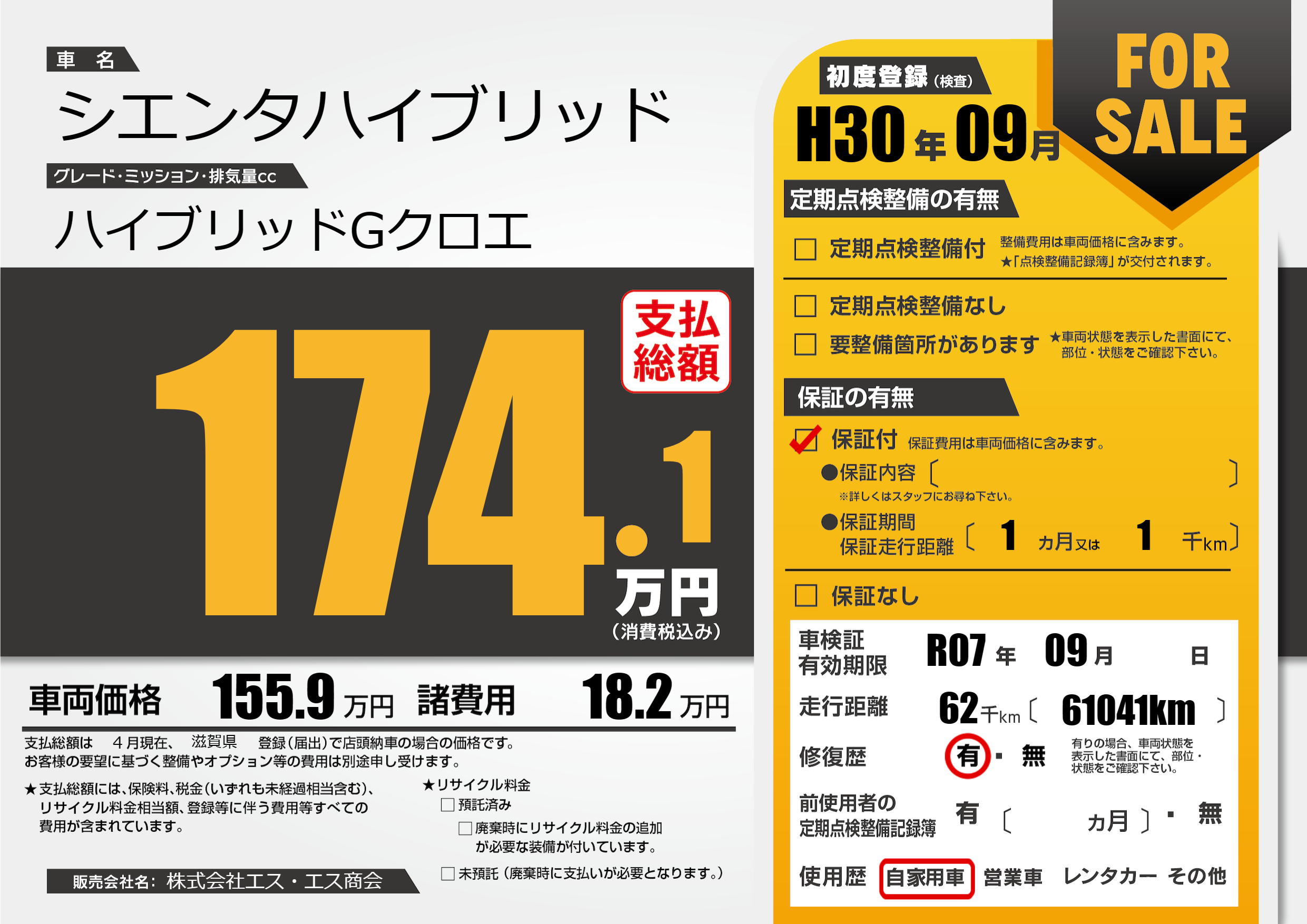 | 車名 | シエンタハイブリッド | グレード ミッション 排気量 |