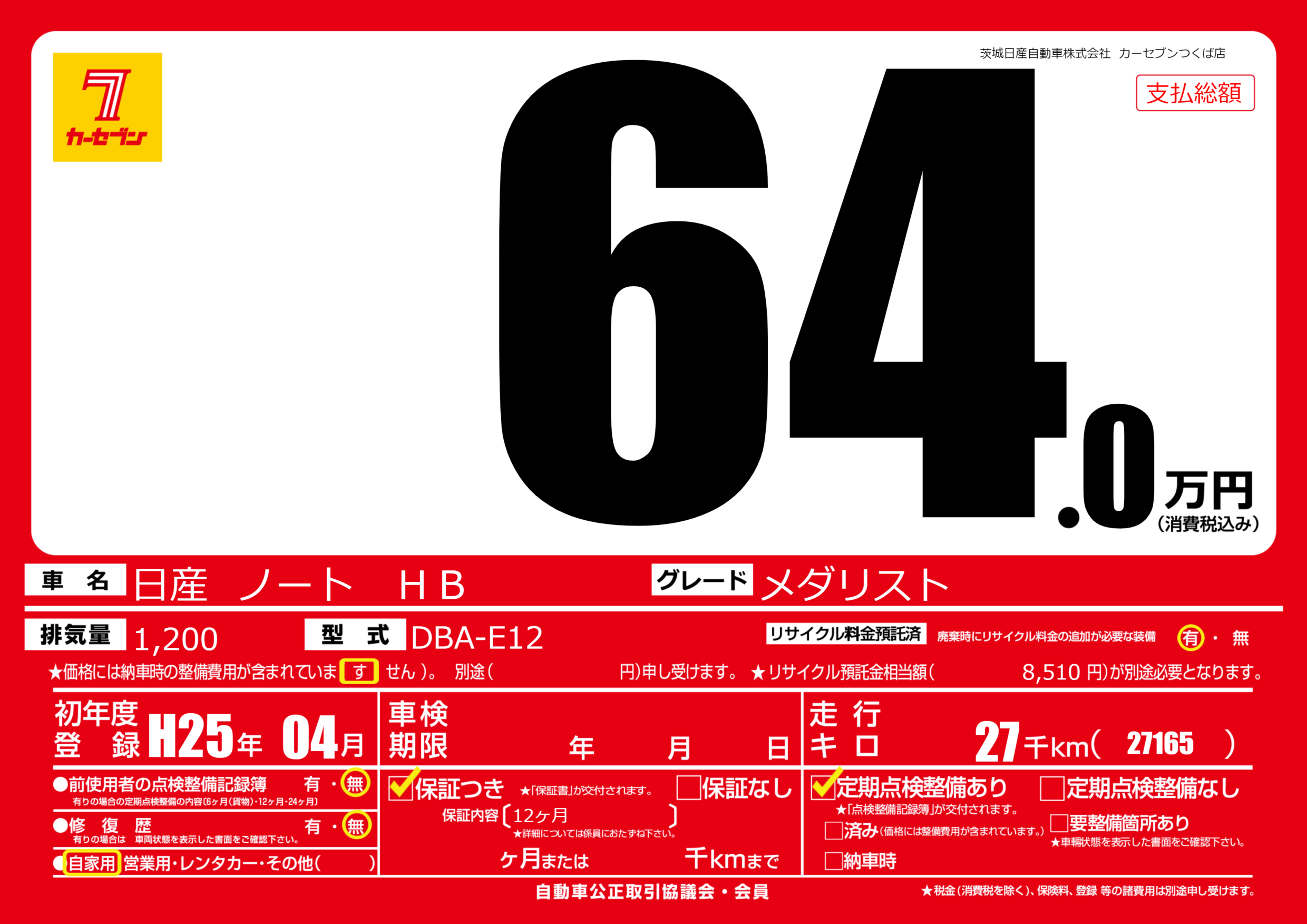 | 車名 | 日産 ノート HB | グレード ミッション 排気量 |