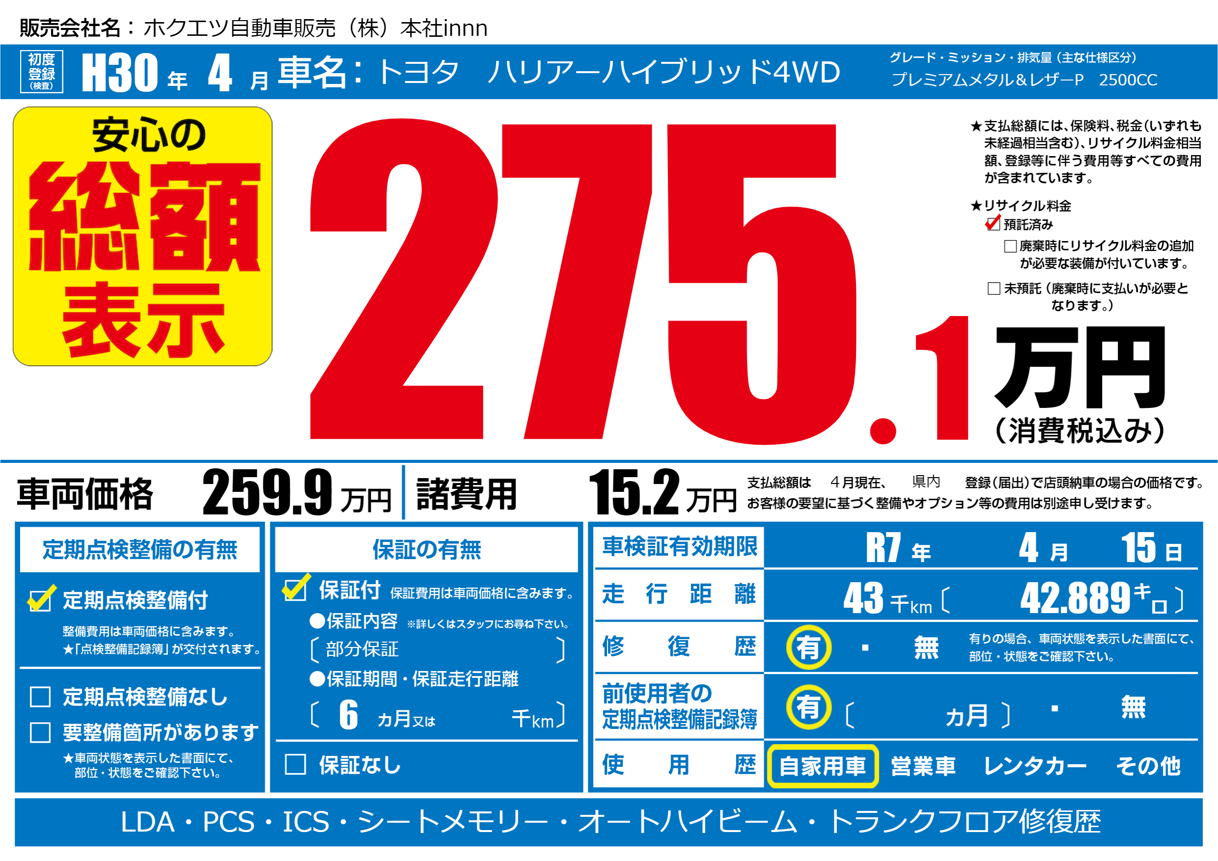 | 車名 | トヨタ ハリアーハイブリッド4WD | グレード ミッション 排気量 |