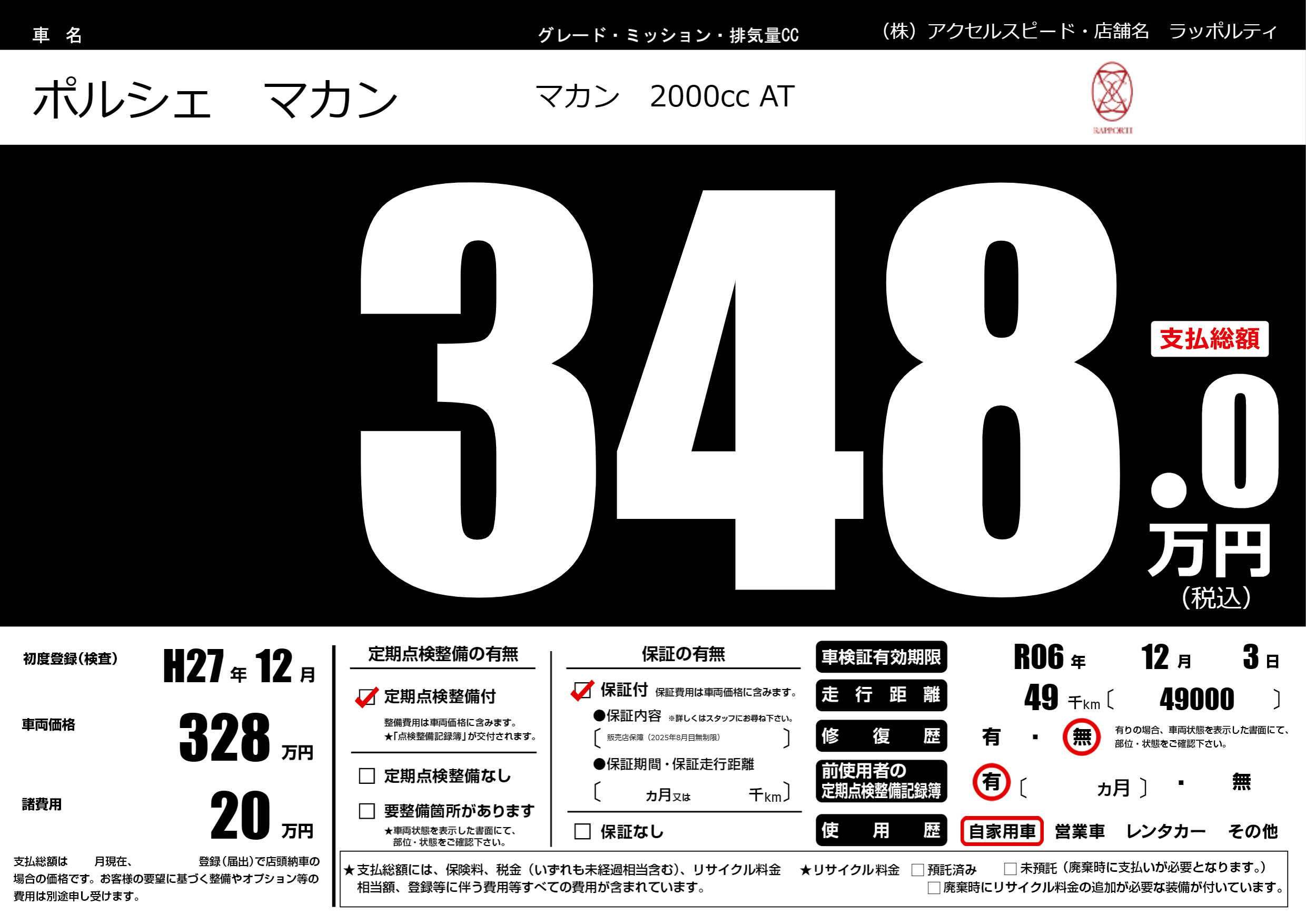 | 車名 | ポルシェ マカン | グレード ミッション 排気量 |