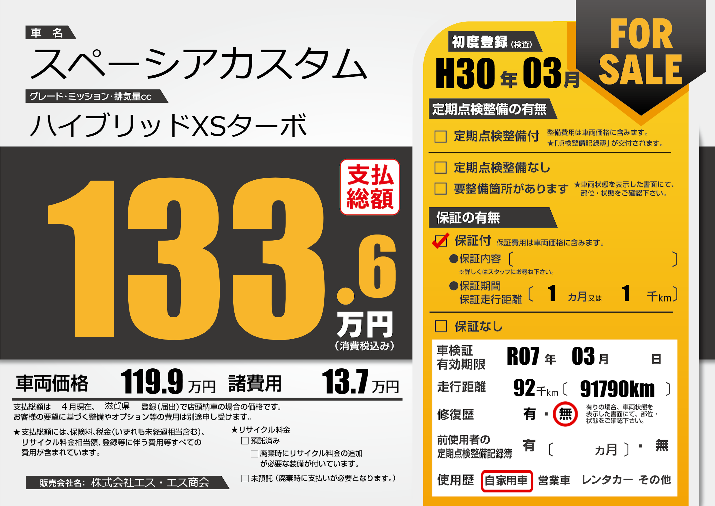 | 車名 | スペーシアカスタム | グレード ミッション 排気量 |