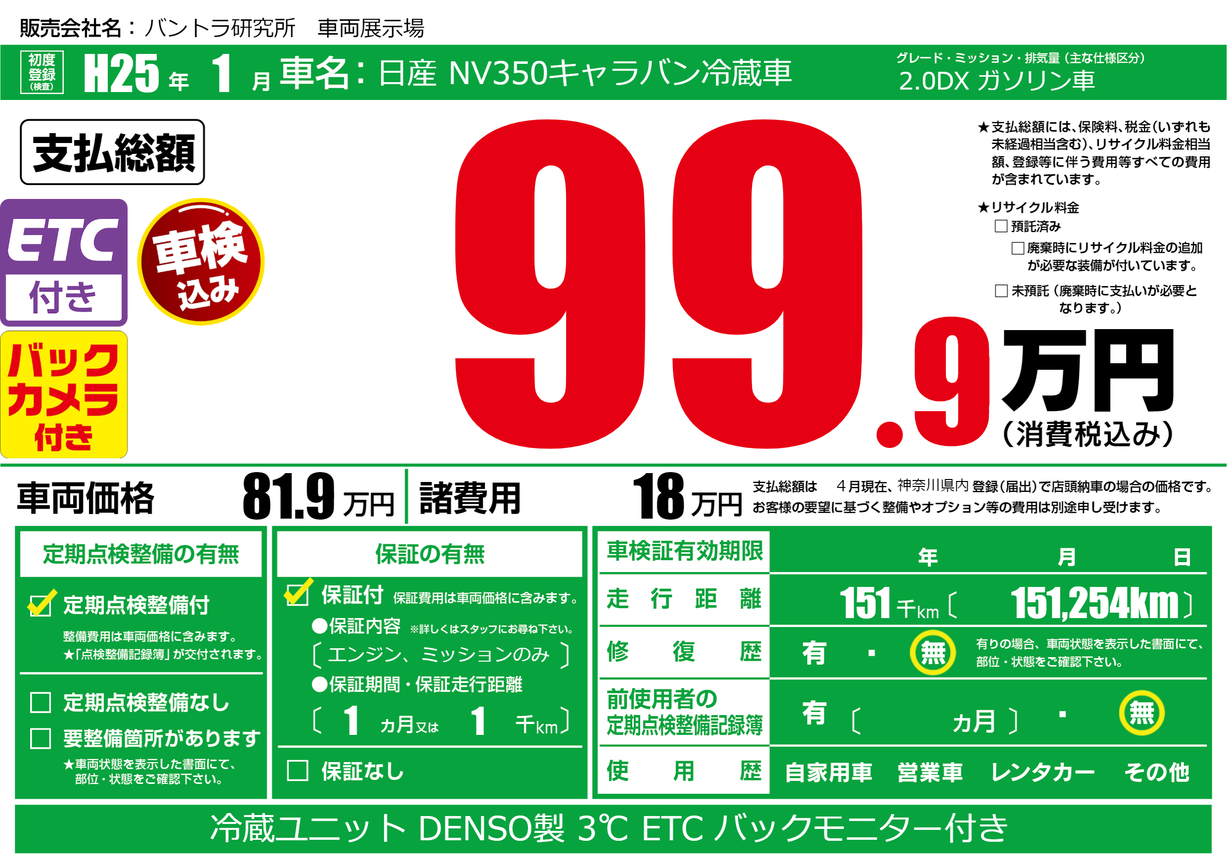 | 車名 | 日産 NV350キャラバン冷蔵車 | グレード ミッション 排気量 |