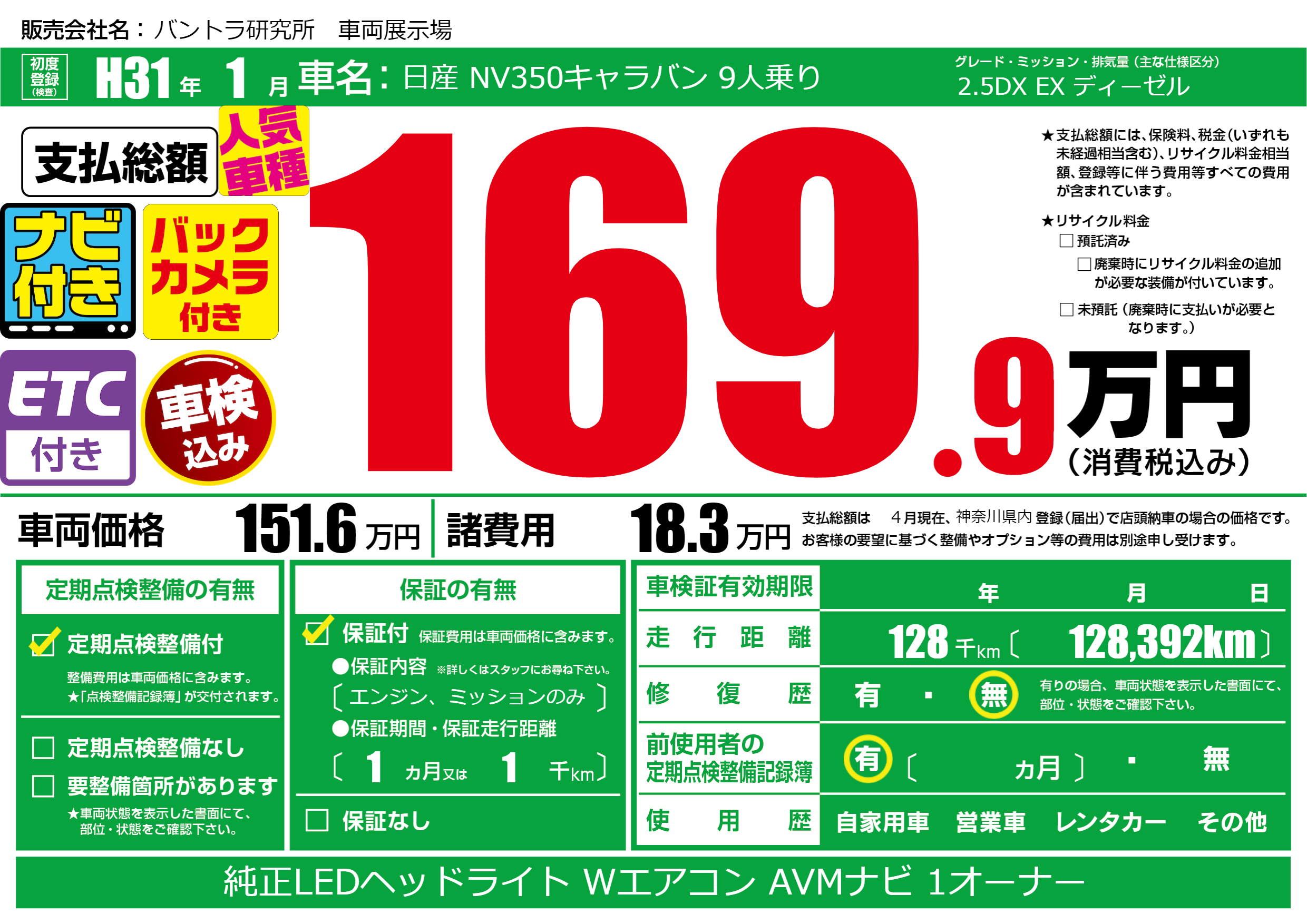 | 車名 | 日産 NV350キャラバン 9人乗り | グレード ミッション 排気量 |