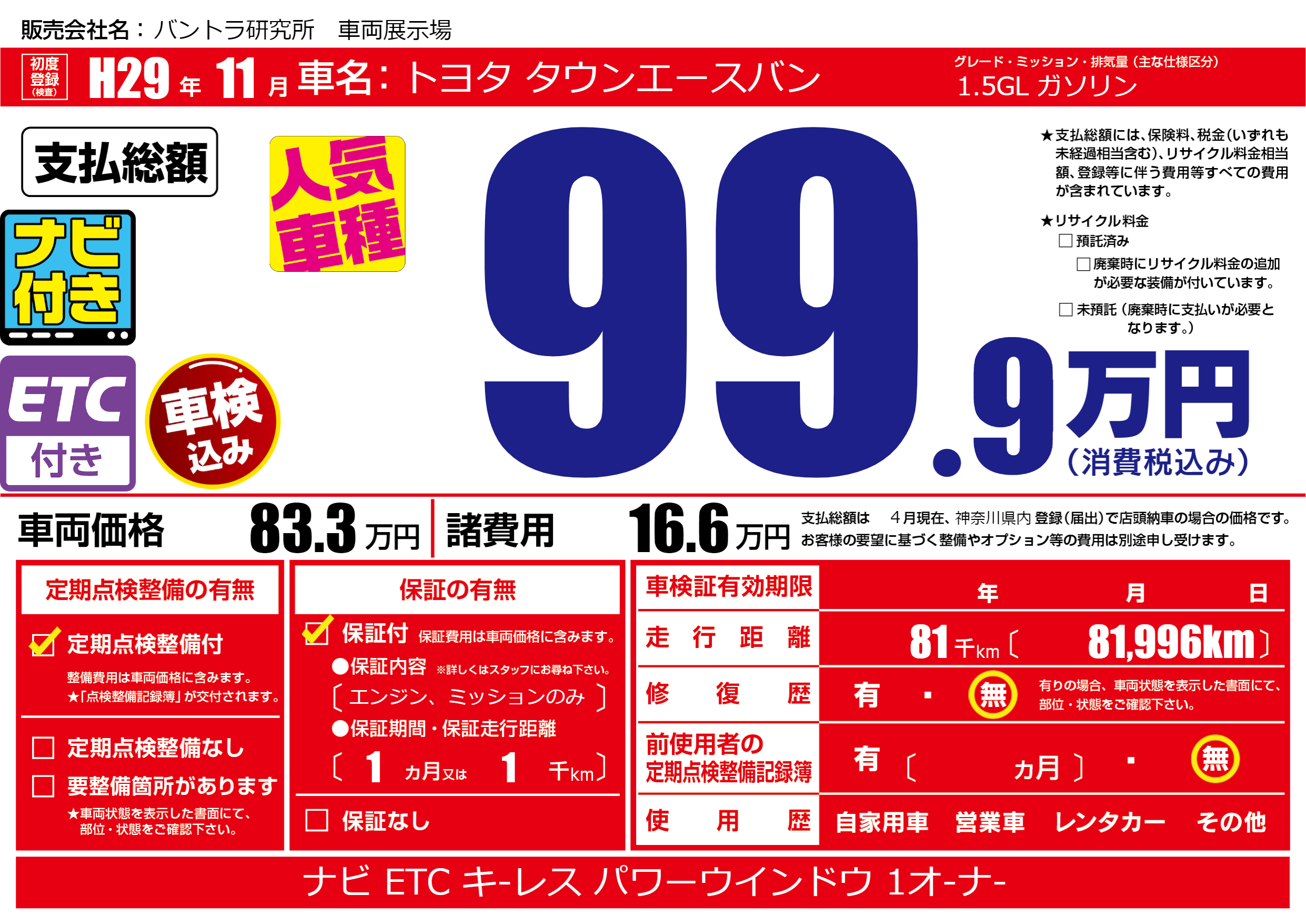 | 車名 | トヨタ タウンエースバン | グレード ミッション 排気量 |