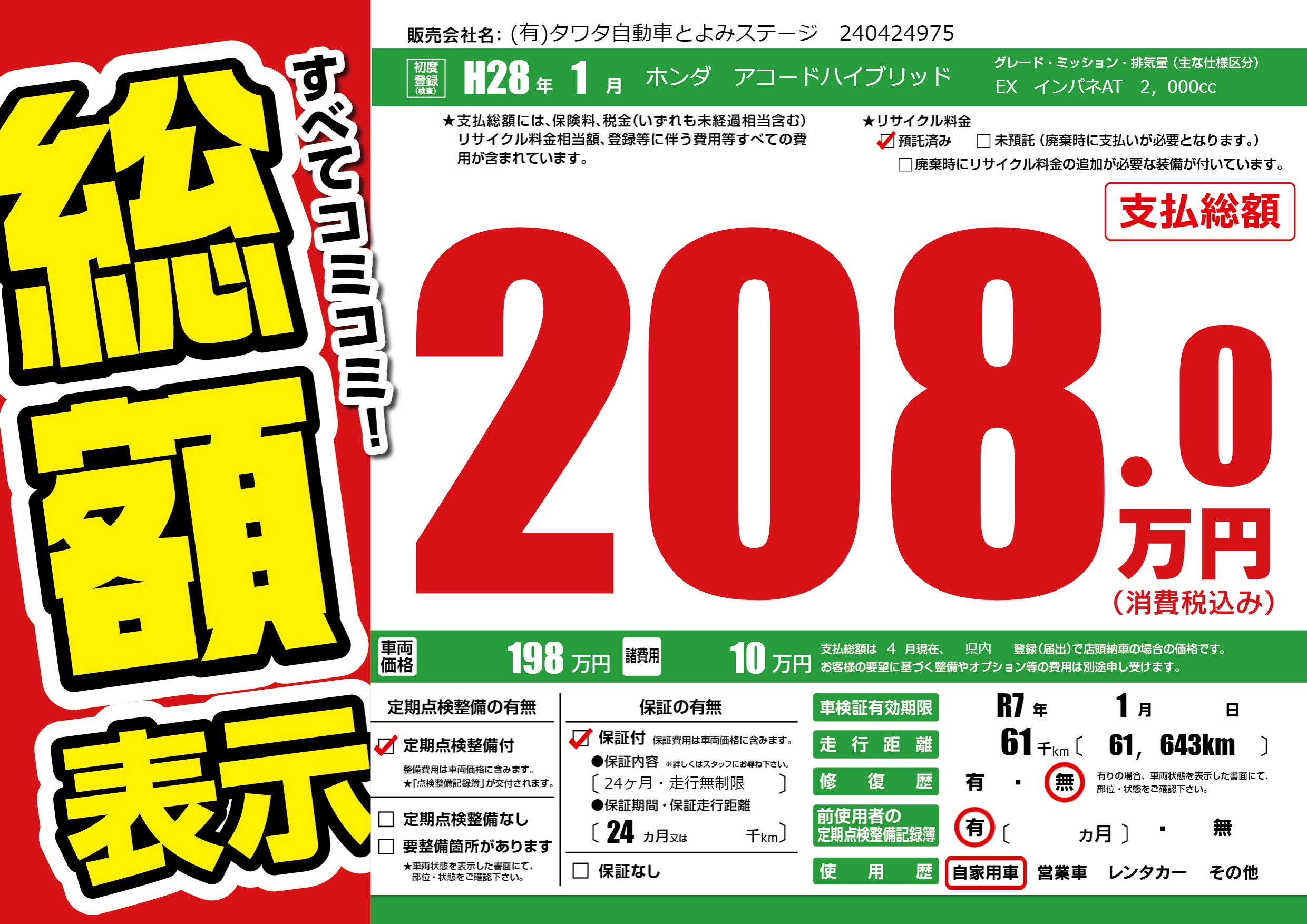| 車名 | ホンダ アコードハイブリッド | グレード ミッション 排気量 |