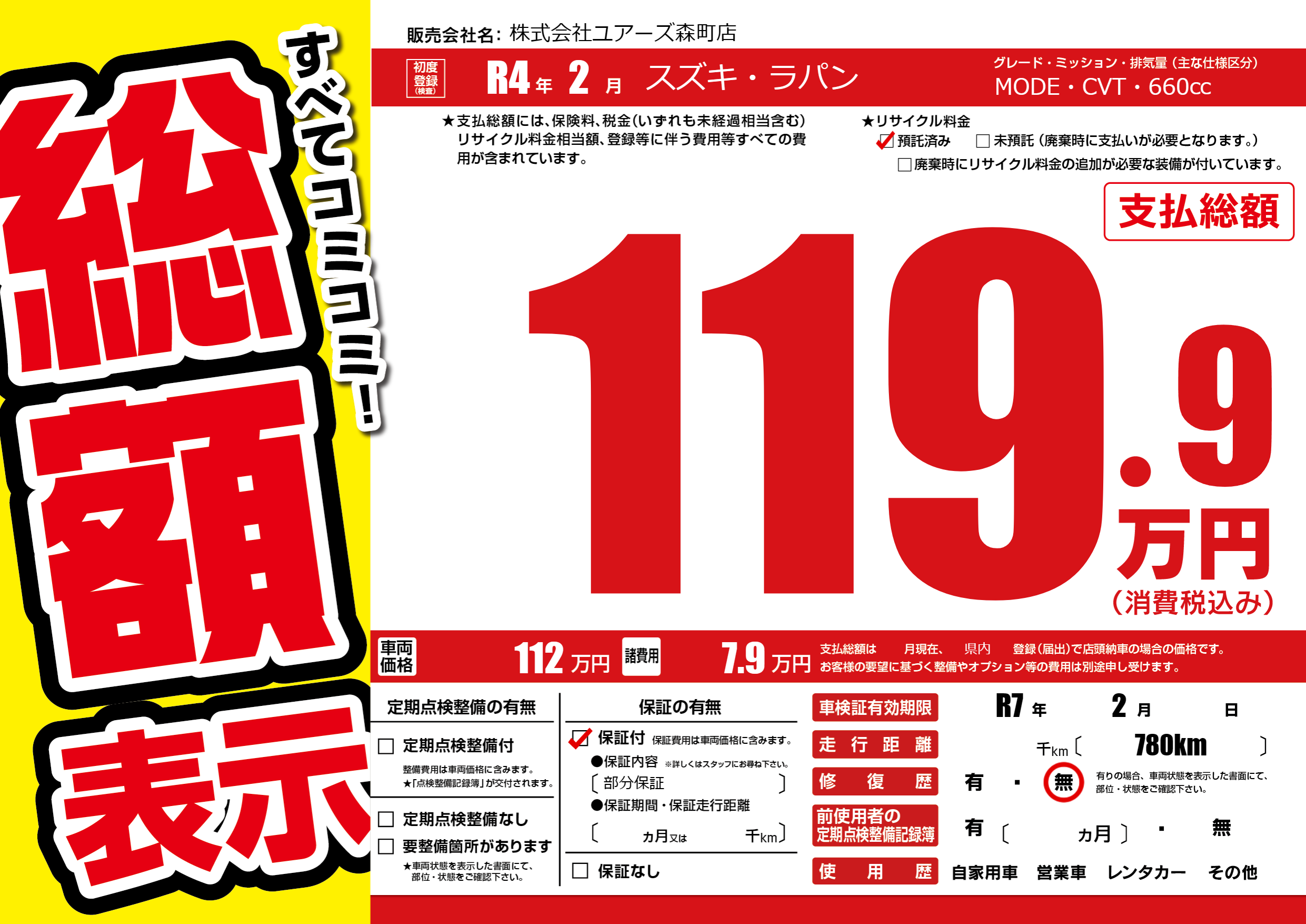 保証付き 保証内容(部分保証) ---ヶ月または()千kmまで |