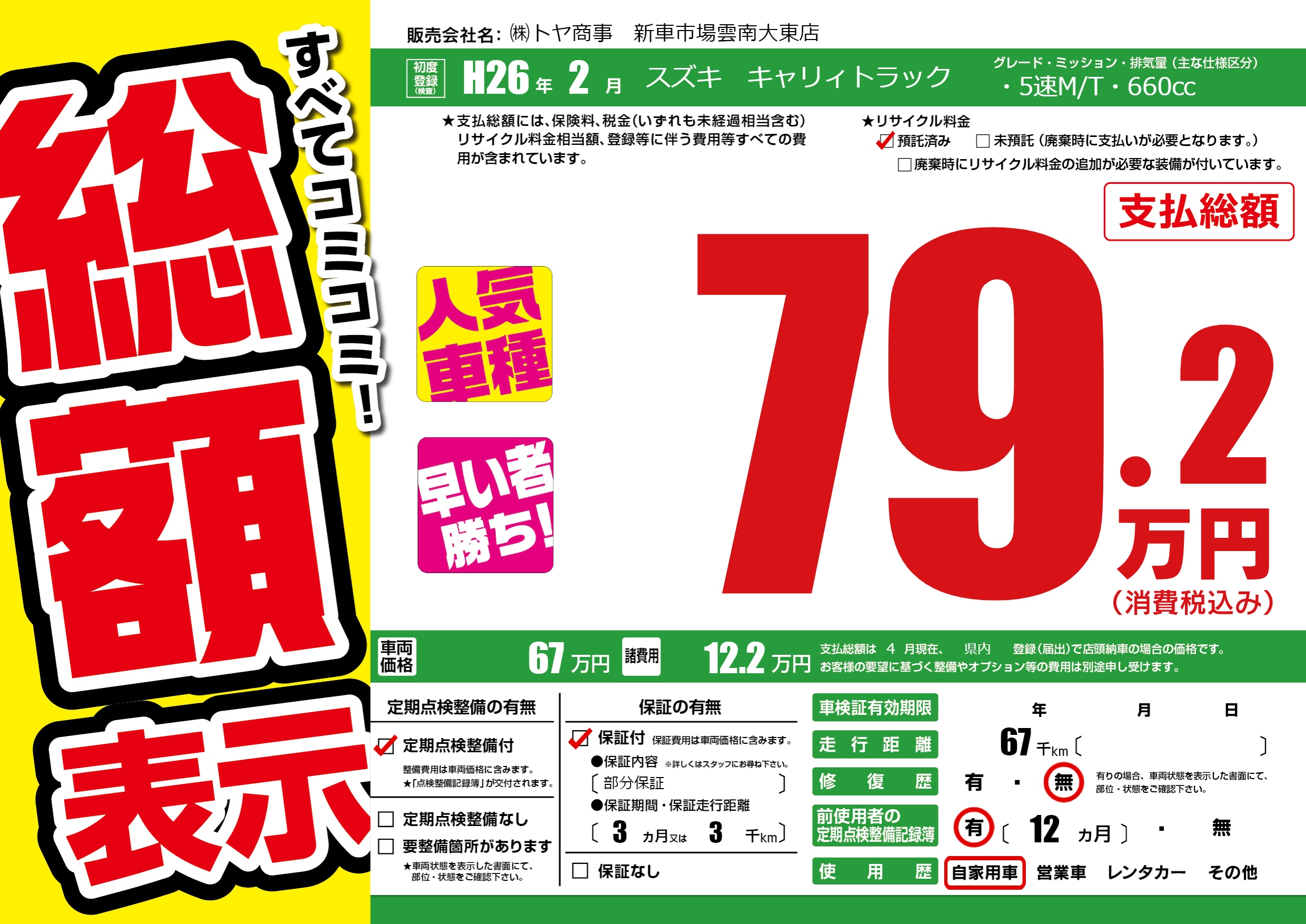 | 車名 | スズキ キャリィトラック | グレード ミッション 排気量 |