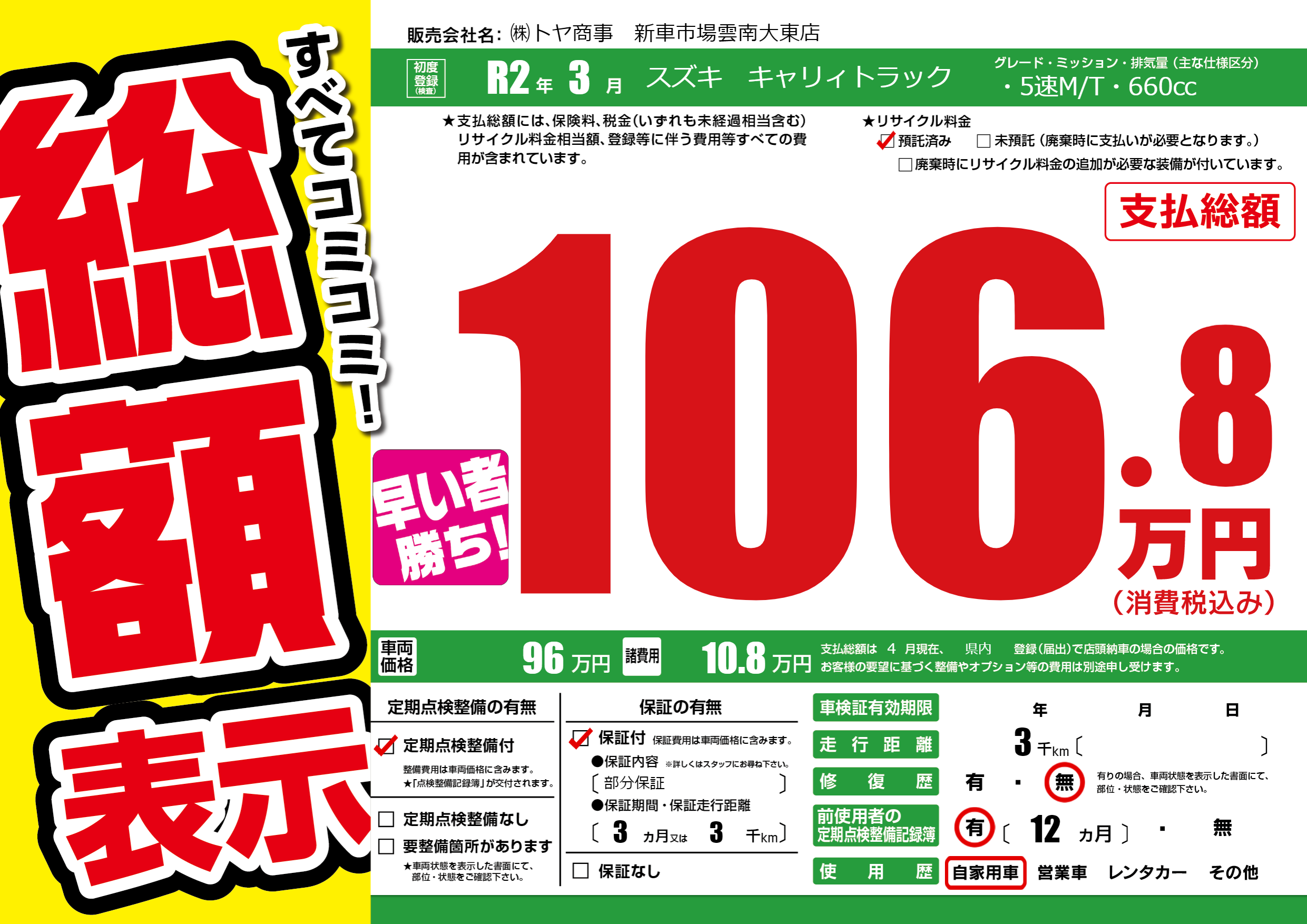 | 車名 | スズキ キャリィトラック | グレード ミッション 排気量 |