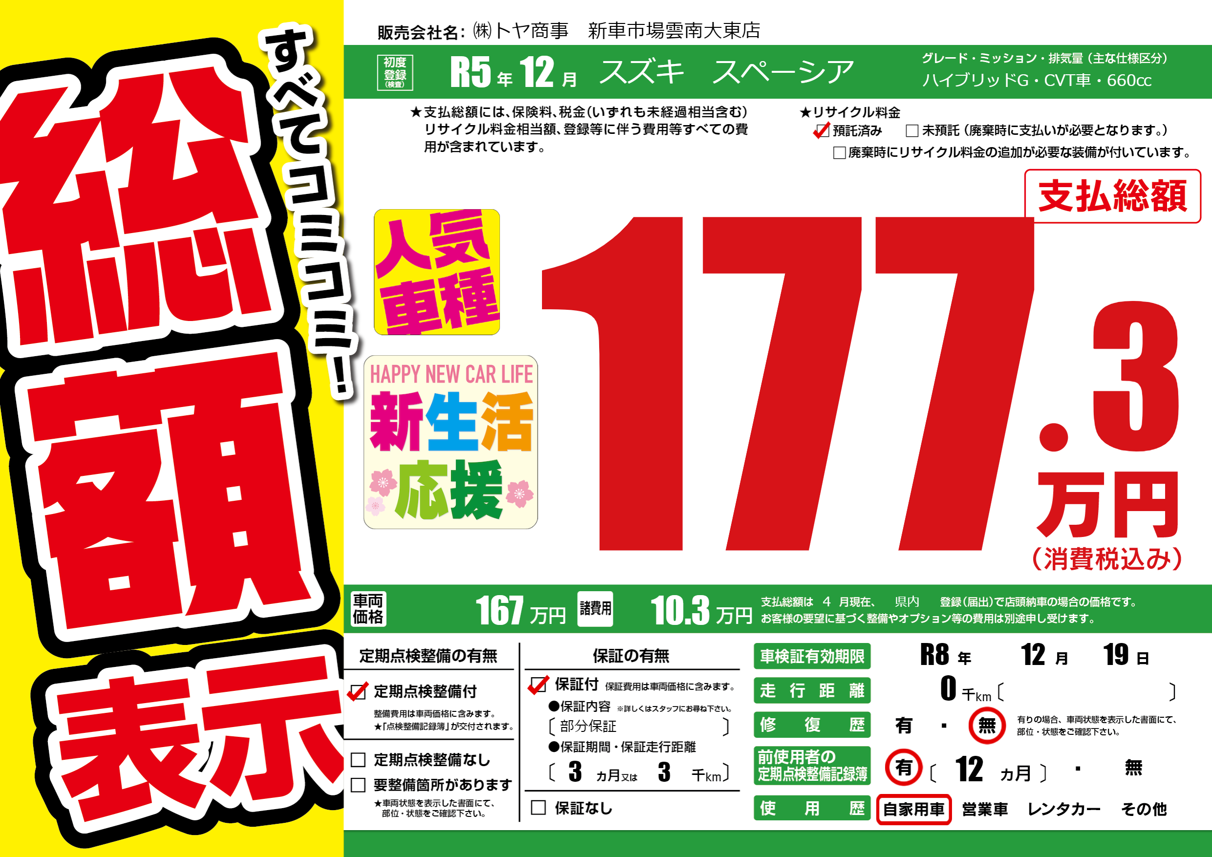 | 車名 | スズキ スペーシア | グレード ミッション 排気量 |