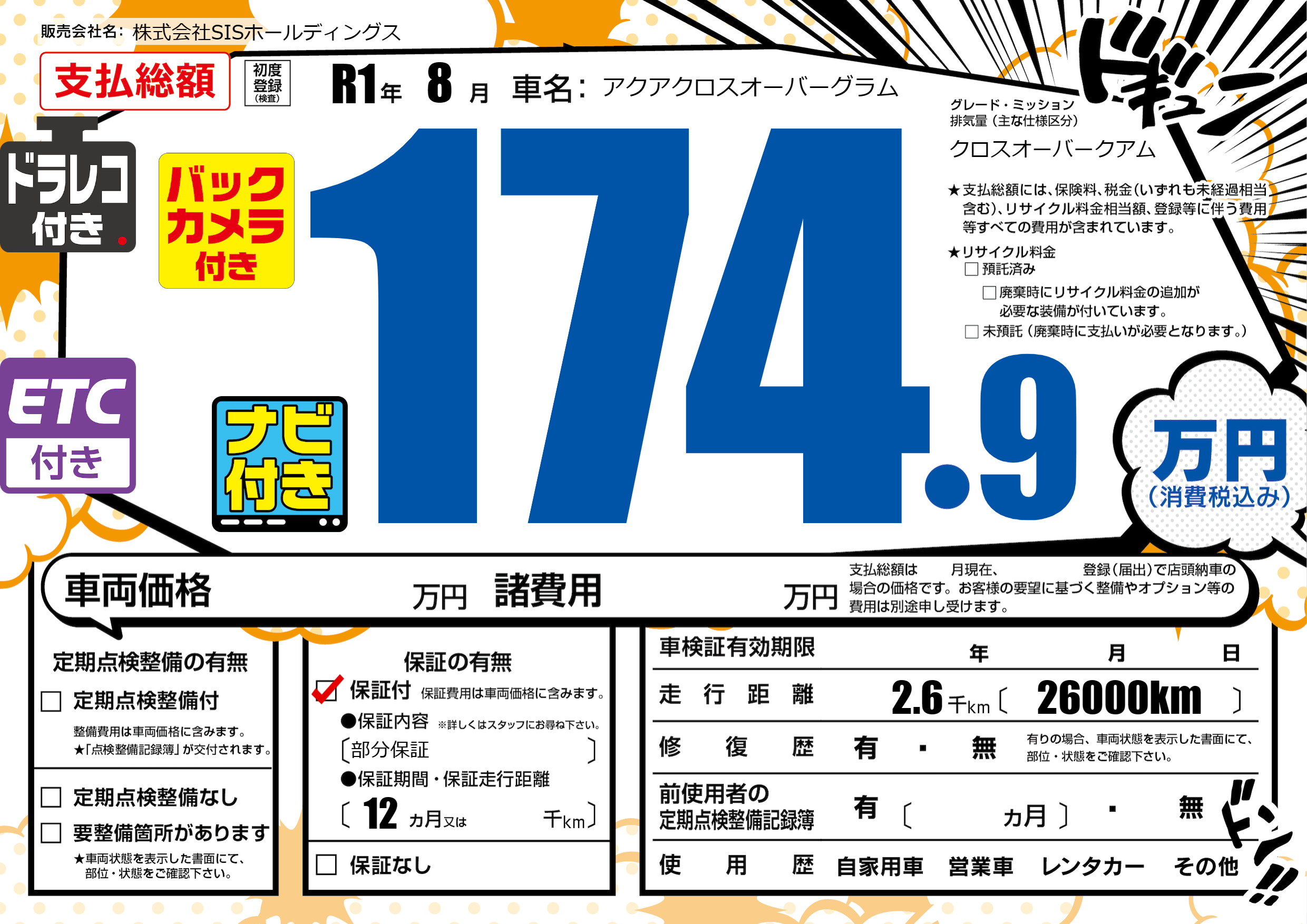 | 車名 | アクアクロスオーバーグラム | グレード ミッション 排気量 |