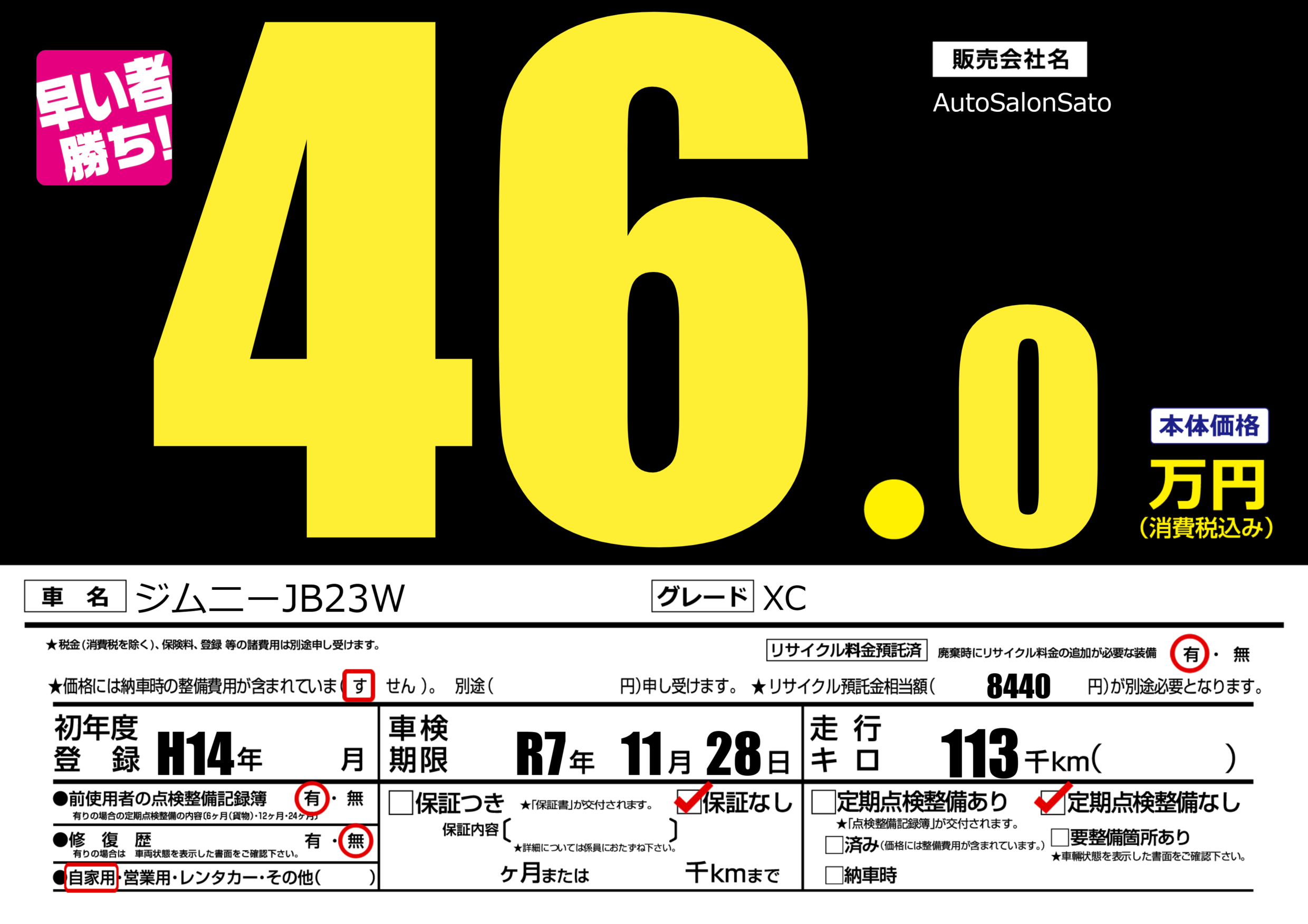 あり | リサイクル預託金相当額 | ( 8440円)が別途必要 |