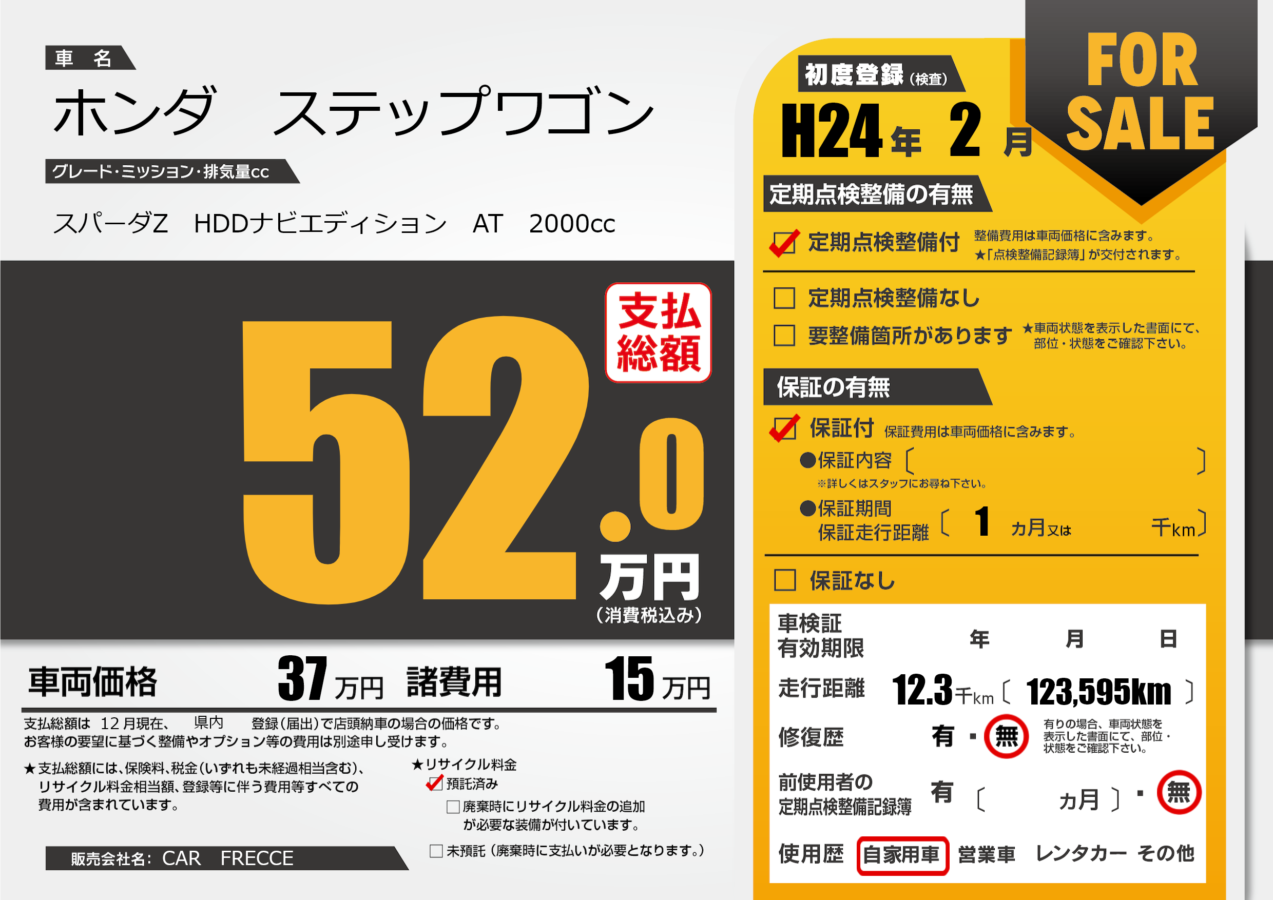 | 車名 | ホンダ ステップワゴン | グレード ミッション 排気量 |