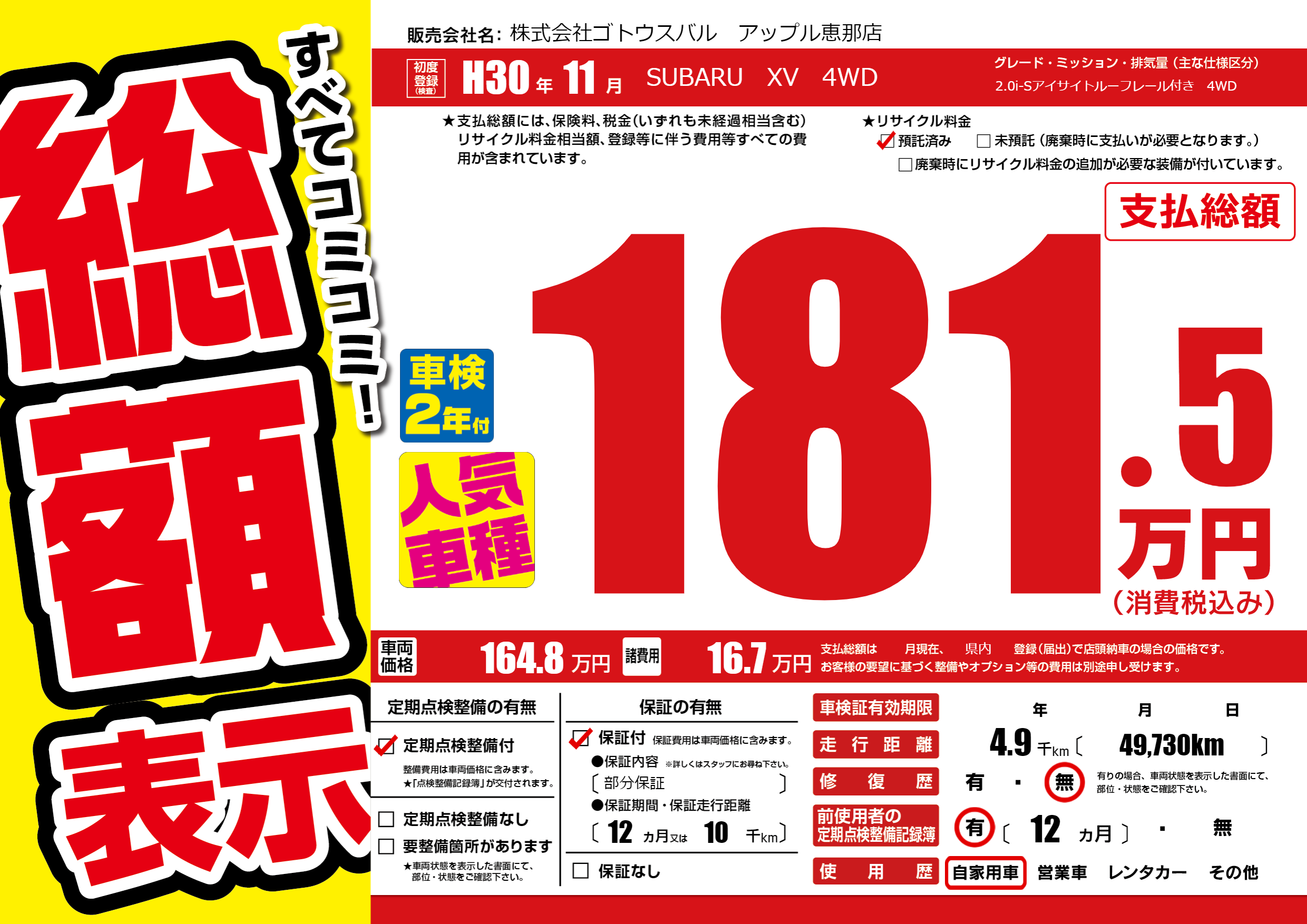 保証付き 保証内容(部分保証) 12ヶ月または(10)千kmまで |