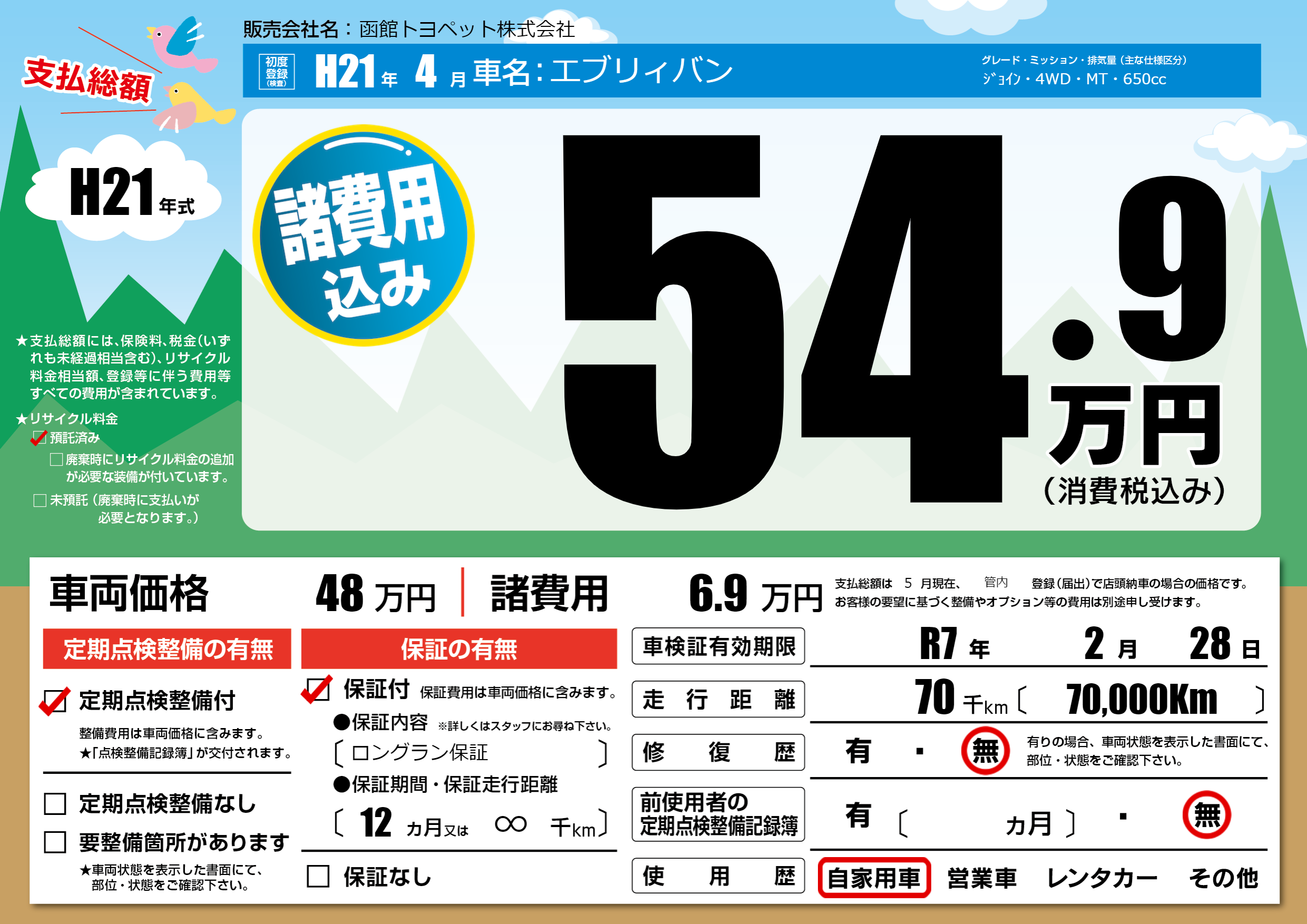 | 車名 | エブリィバン | グレード ミッション 排気量 |