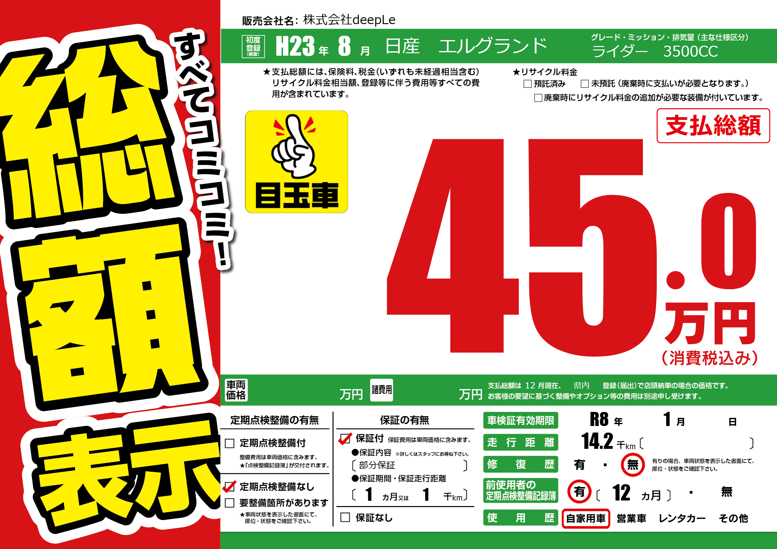 | 車名 | 日産 エルグランド | グレード ミッション 排気量 |