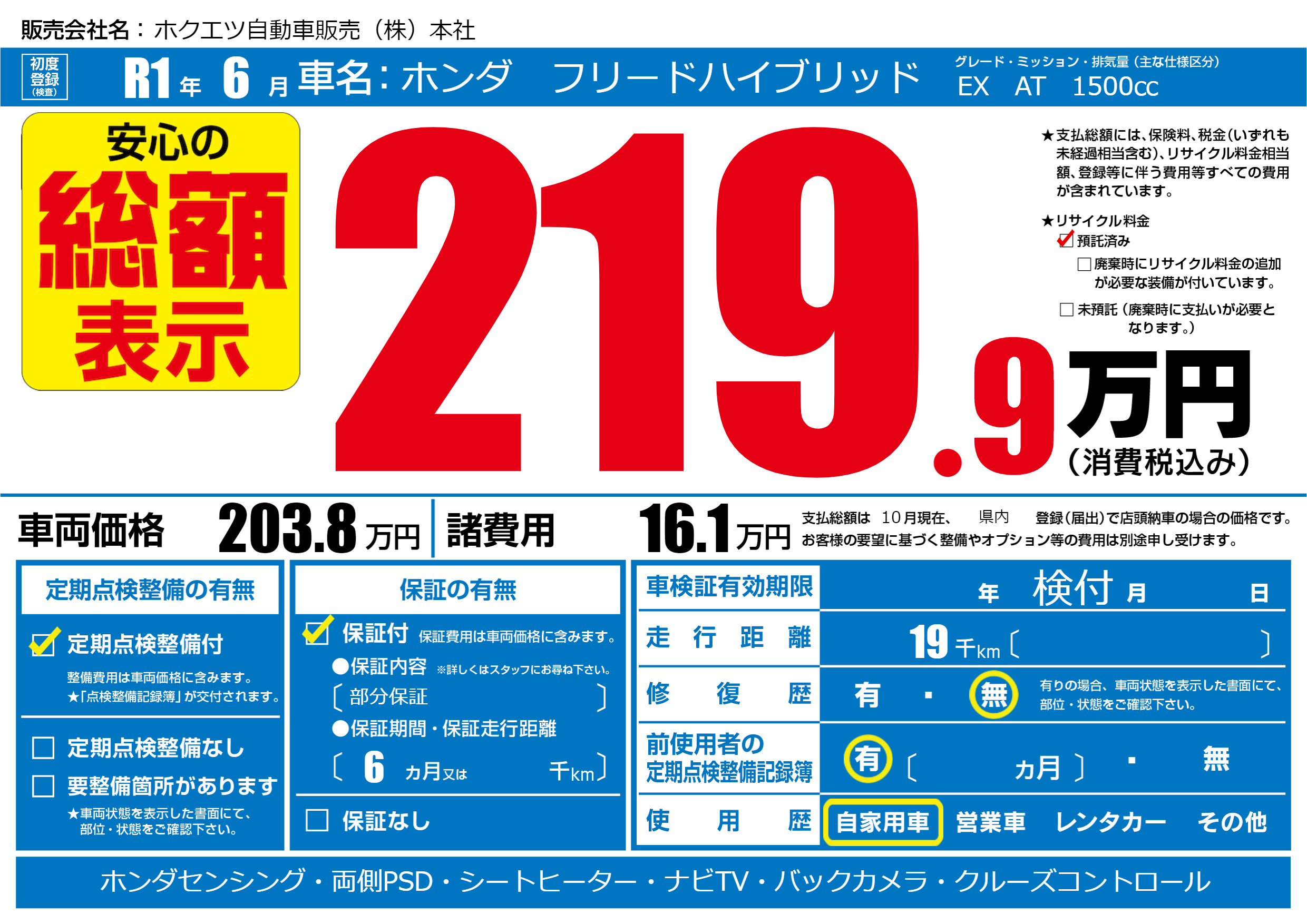 | 車名 | ホンダ フリードハイブリッド | グレード ミッション 排気量 |