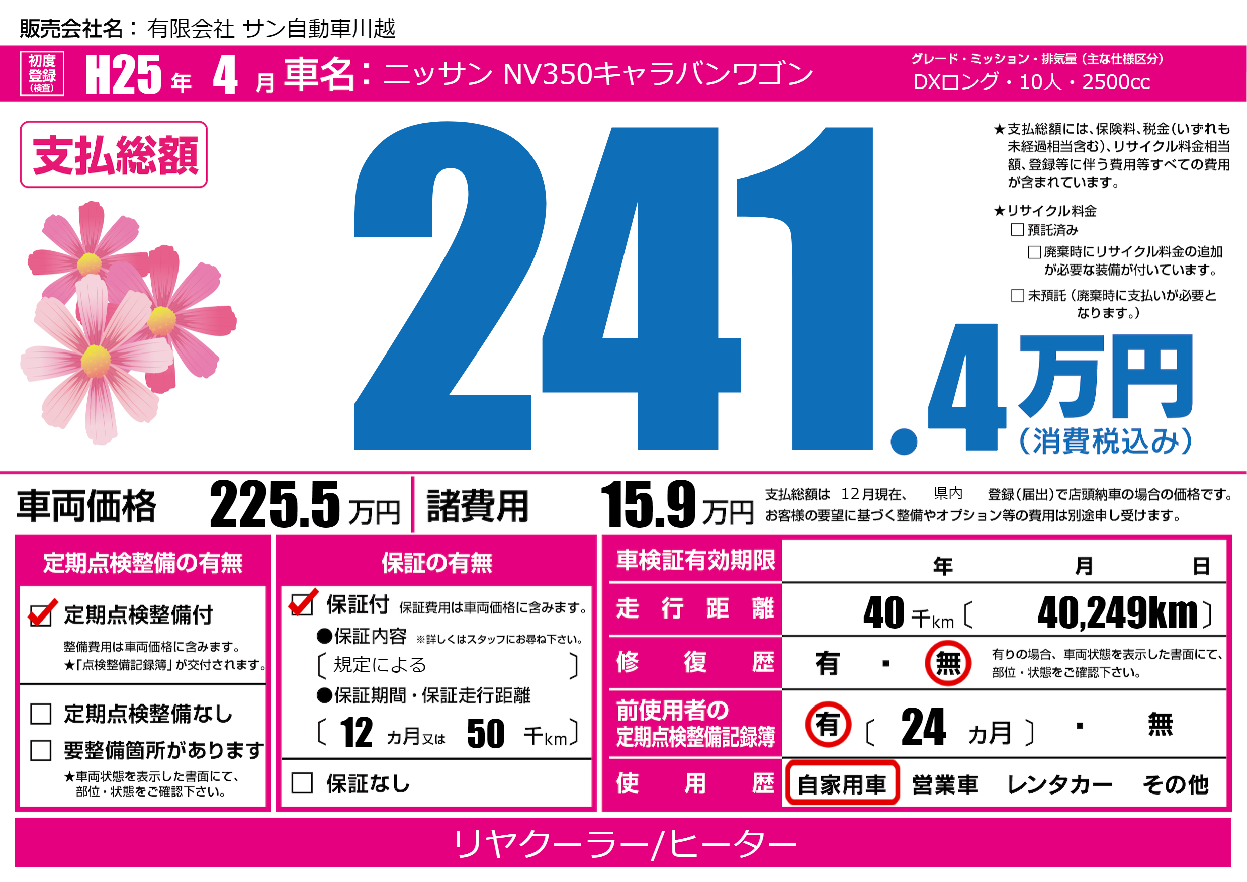 | 車名 | ニッサン NV350キャラバンワゴン | グレード ミッション 排気量 |