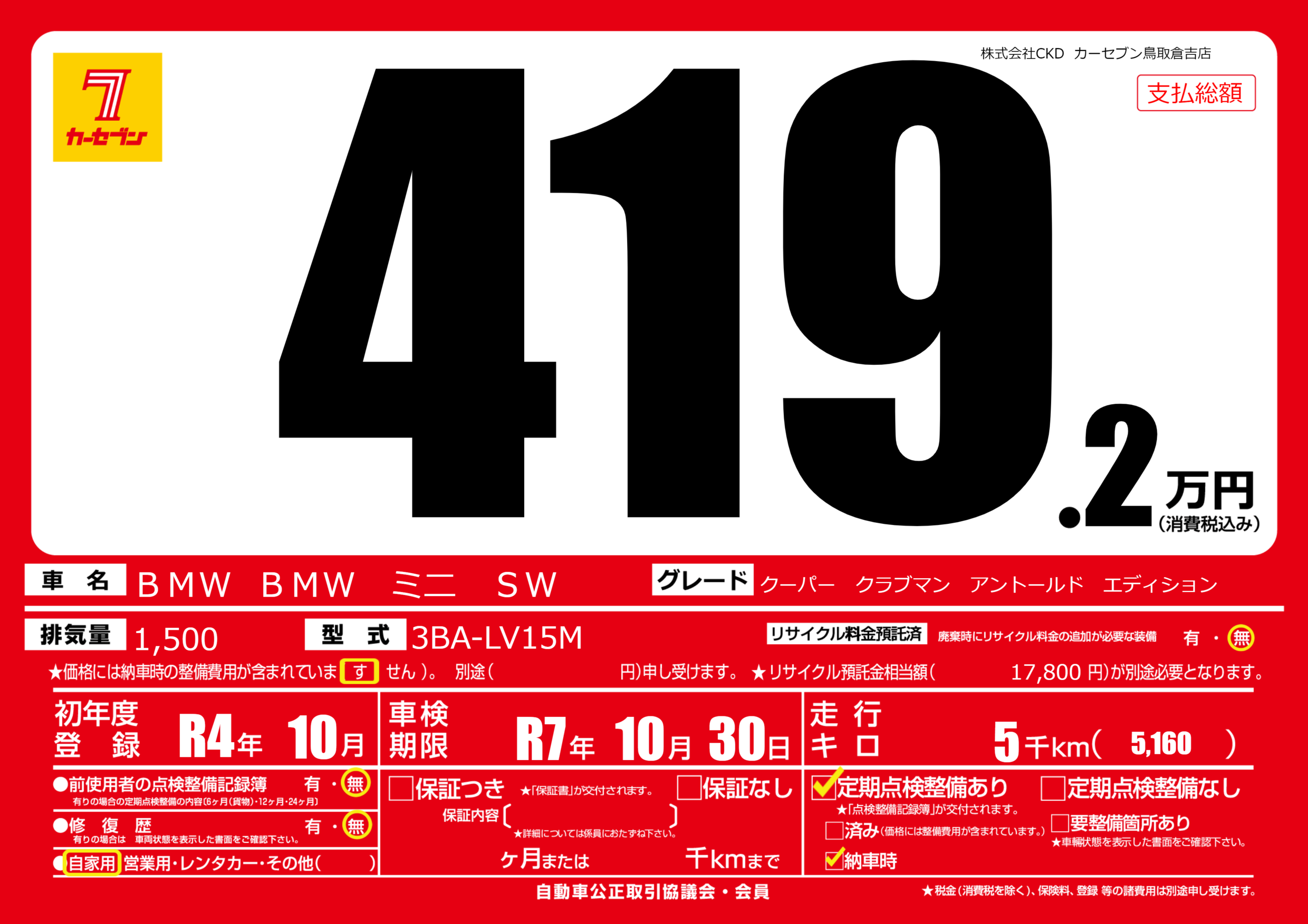 | 車名 | BMW BMW ミニ SW | グレード ミッション 排気量 |
