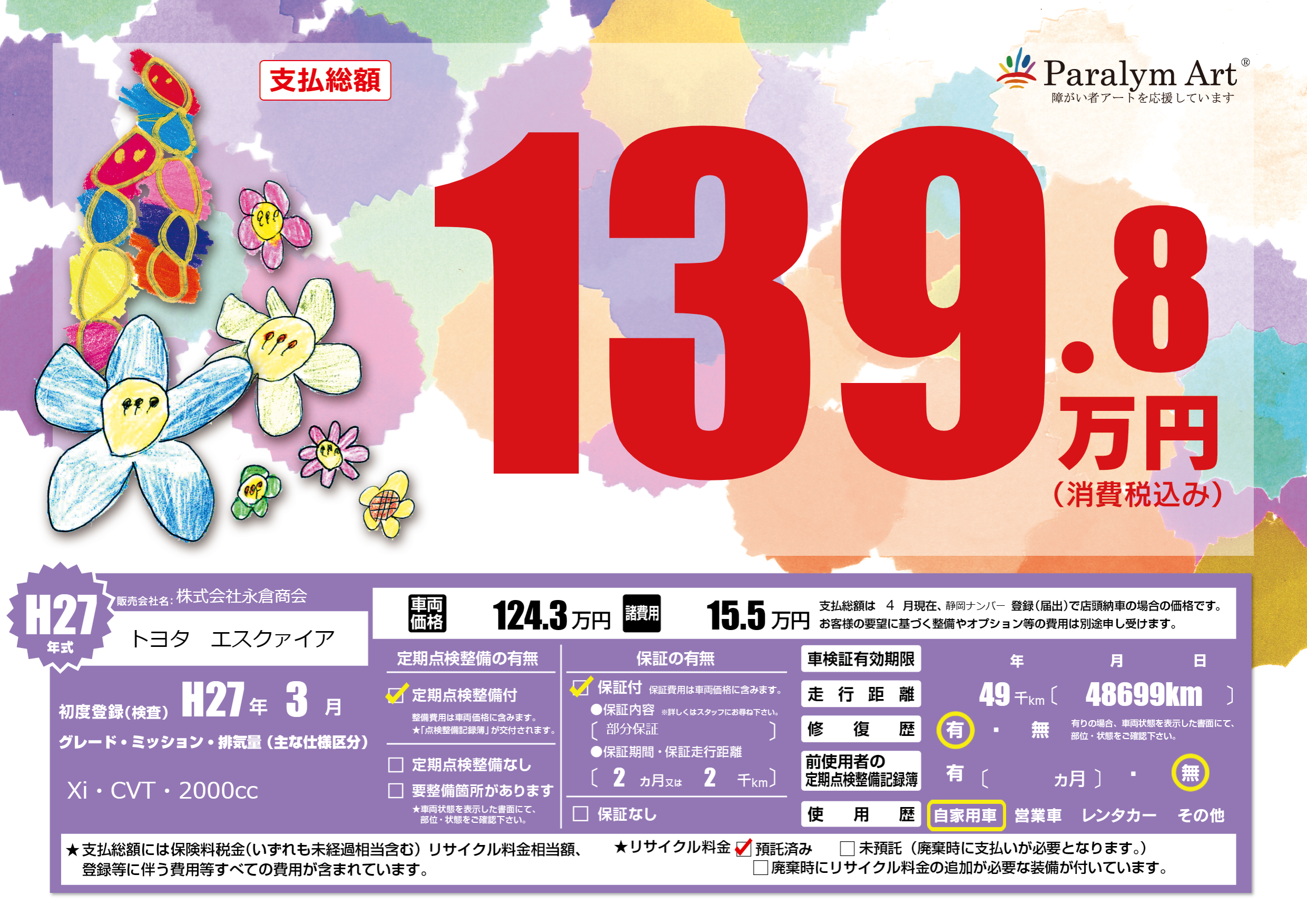 | 走行キロ | 4.9万km | 初年度登録 | H27年3月 |