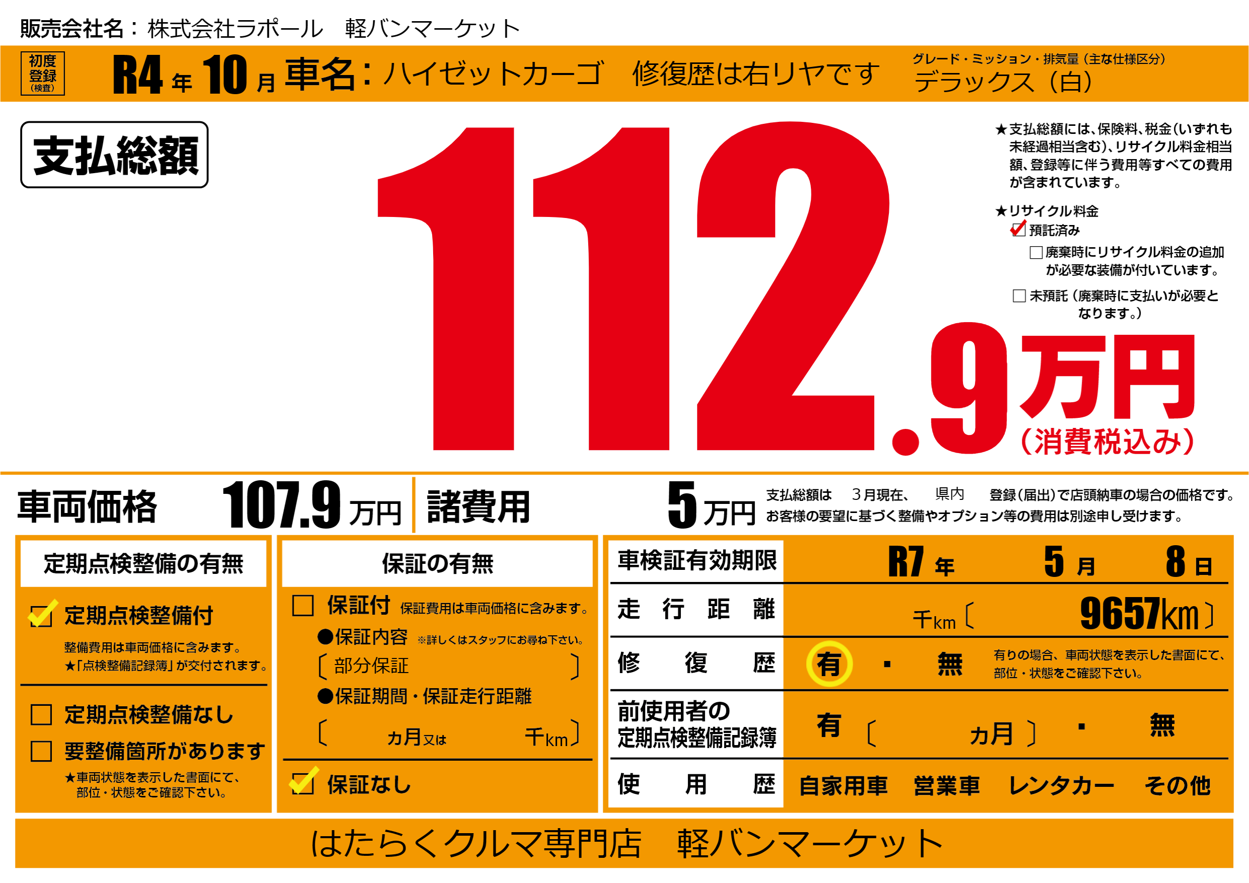 | 車名 | ハイゼットカーゴ 修復歴は右リヤです | グレード ミッション 排気量 |