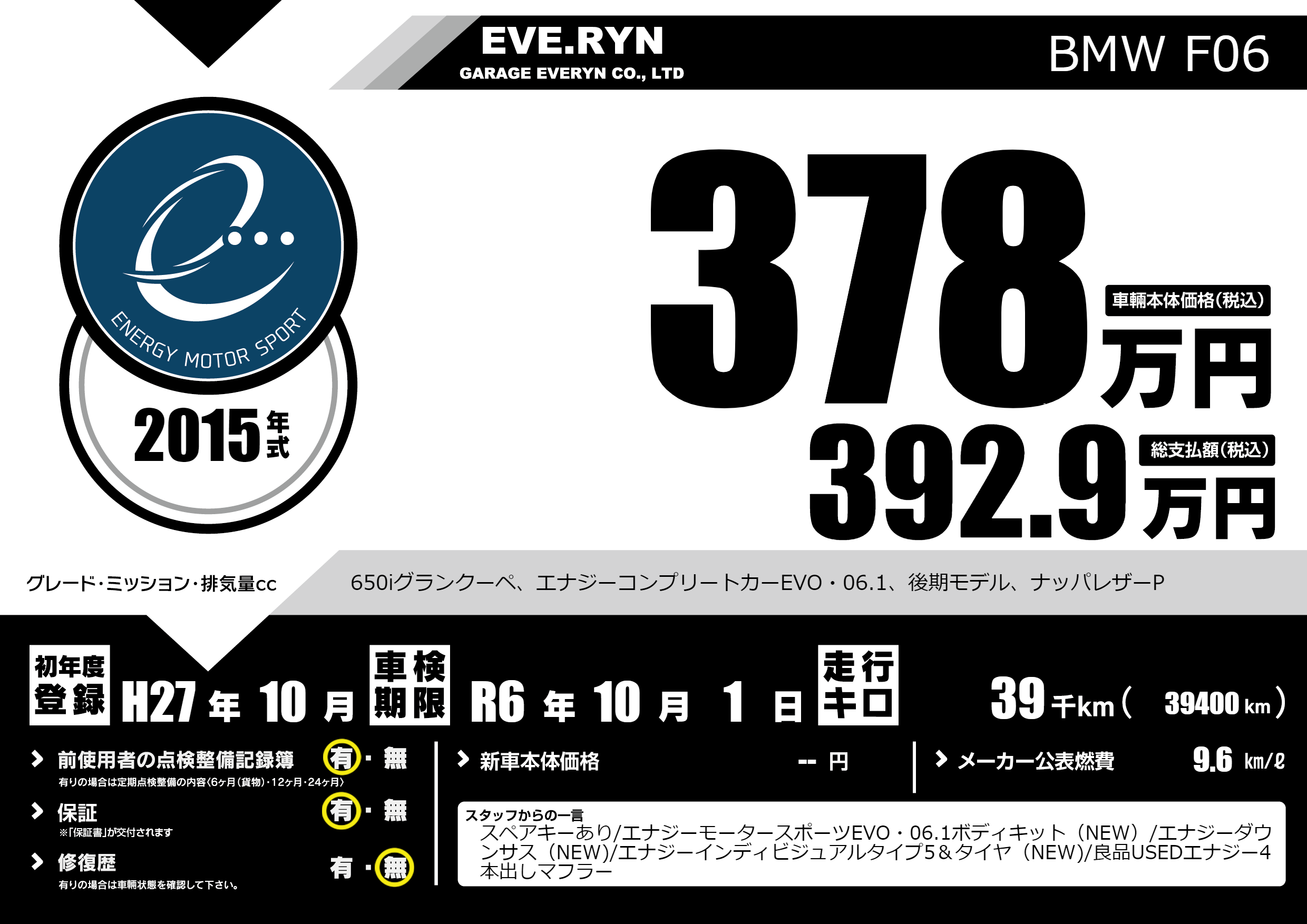 | 車名 | BMW F06 | グレード ミッション 排気量 |
